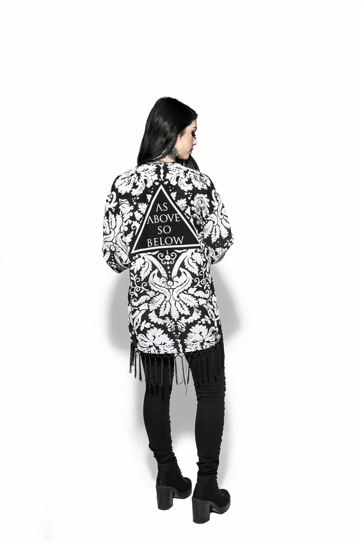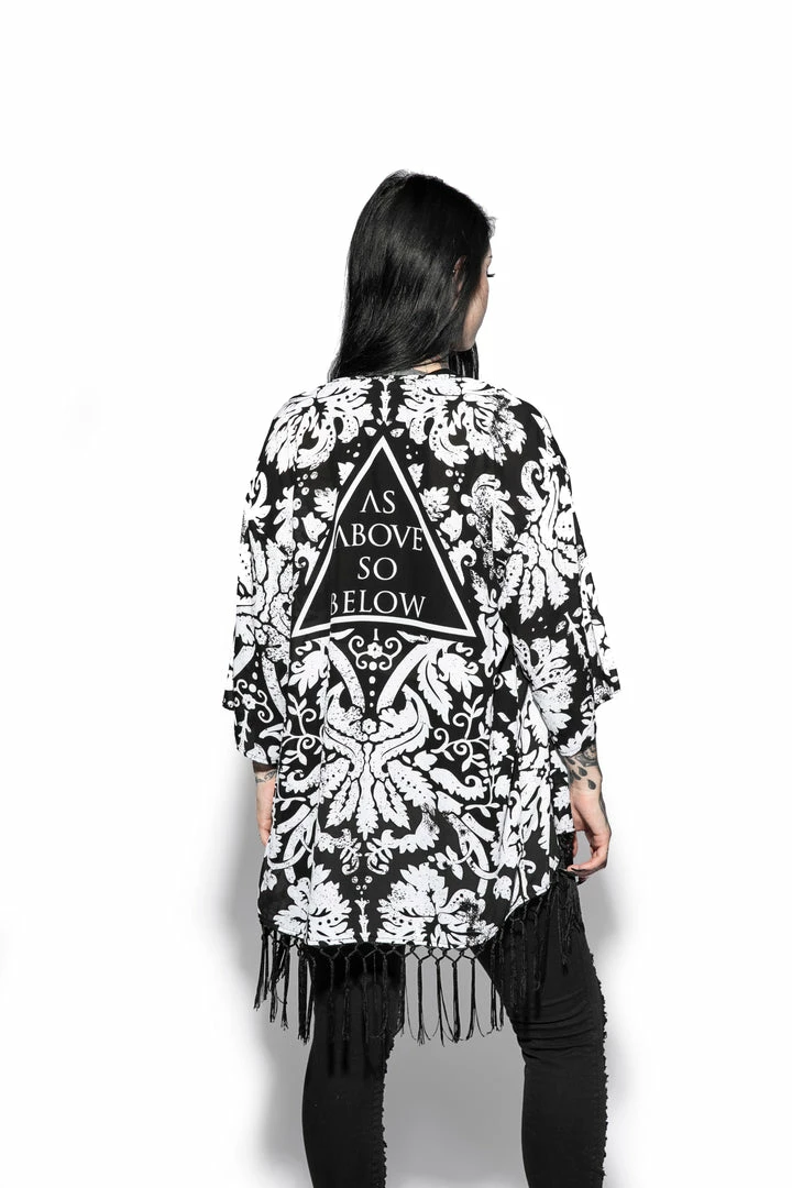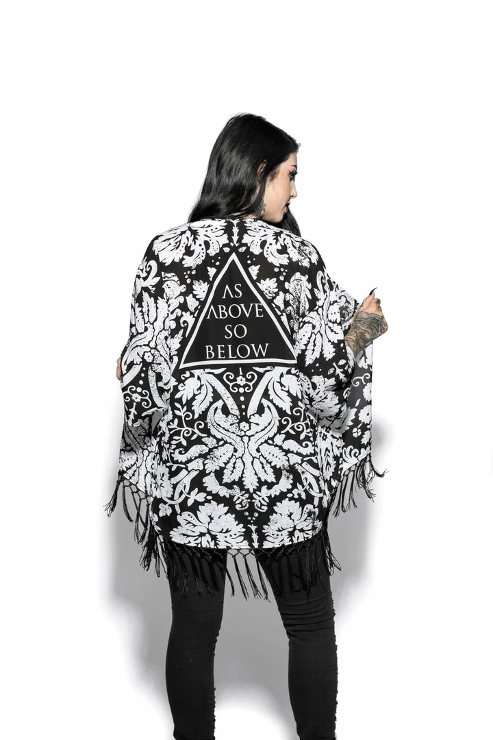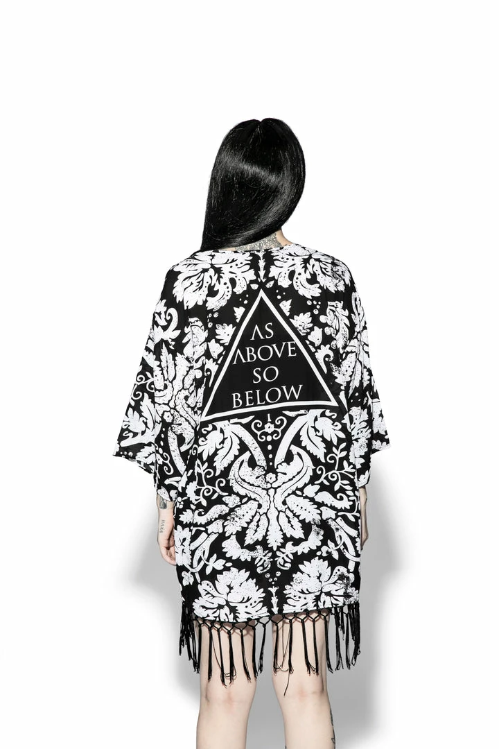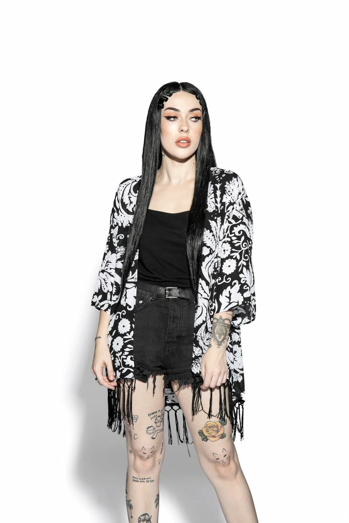 Women’s Oversized kimono with crochet fringe detail at bottom.