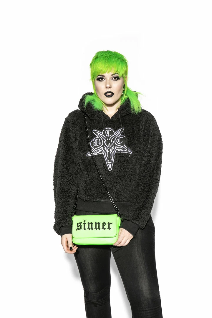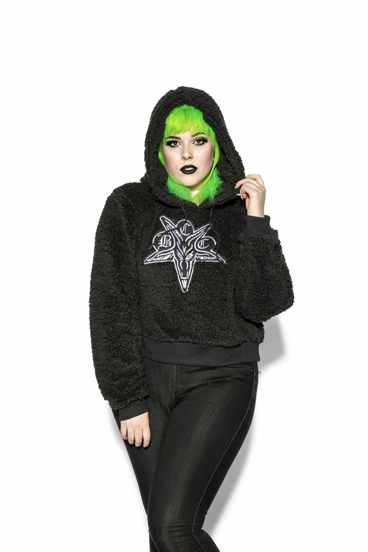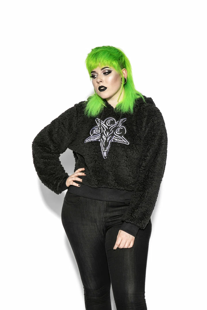 Women’s Sherpa Hoodie in an elongated crop length with BCC Goat patch on the front.