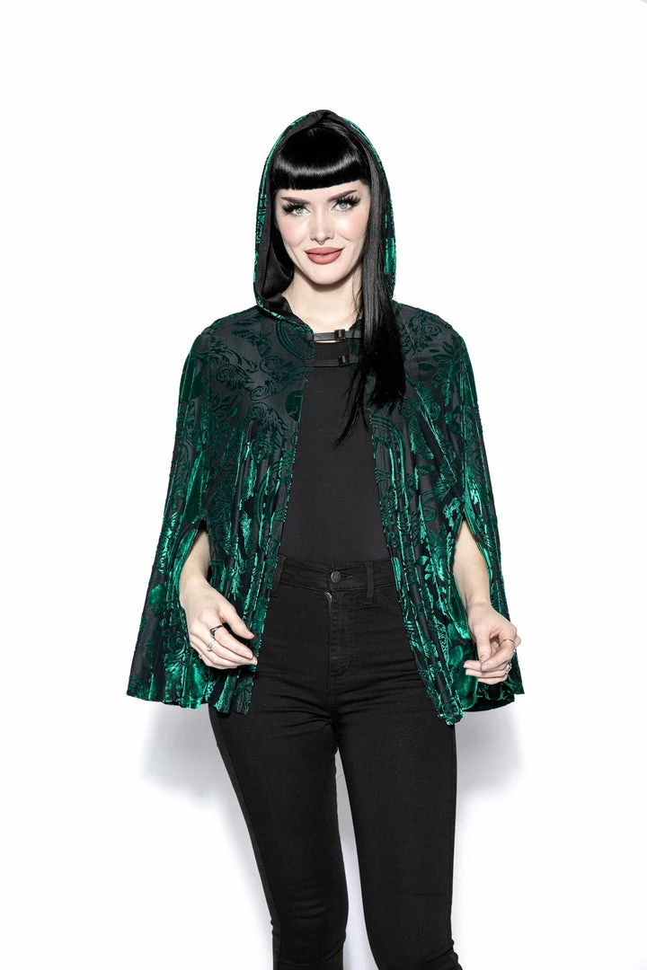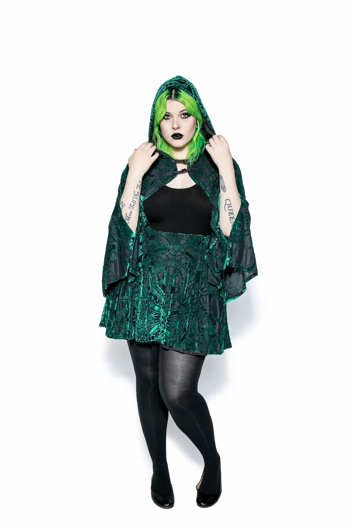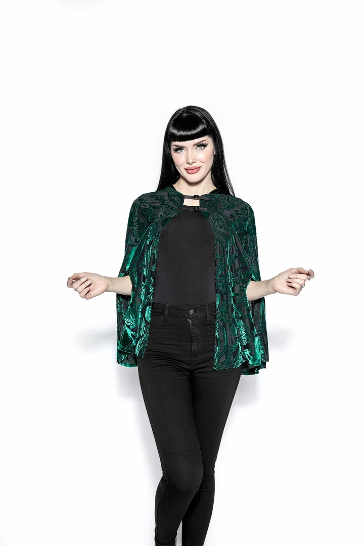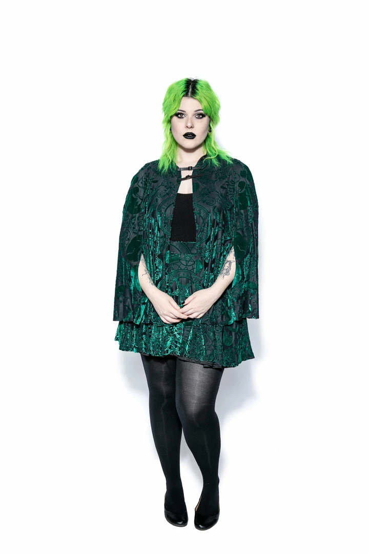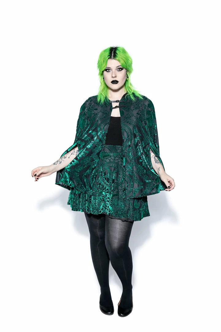 “Little Green Riding Hood” vibes. Part of the green velvet collection, the cape comes in a luxurious green baroque style with clasps to make the hooded cape look. It features arm holes to keep the shape of the cape while keeping you covered. It is soft to the touch with a slight stretch.