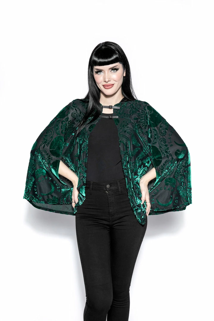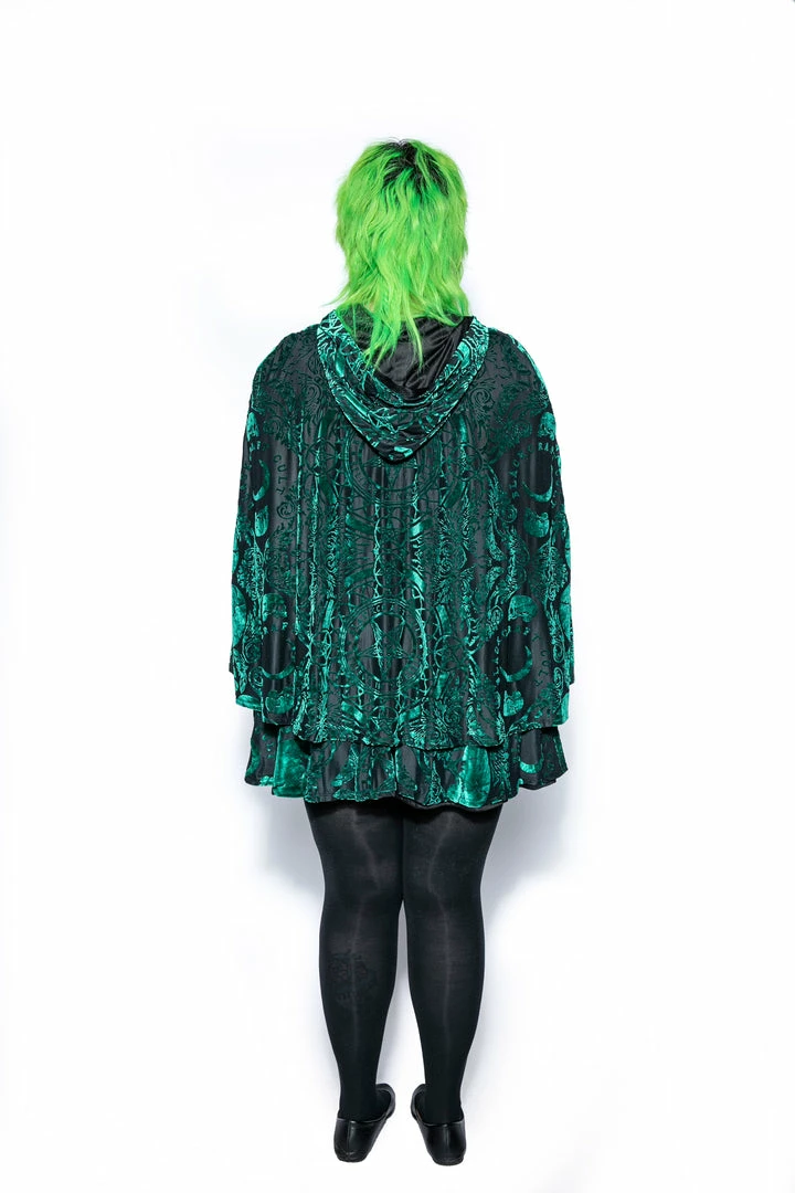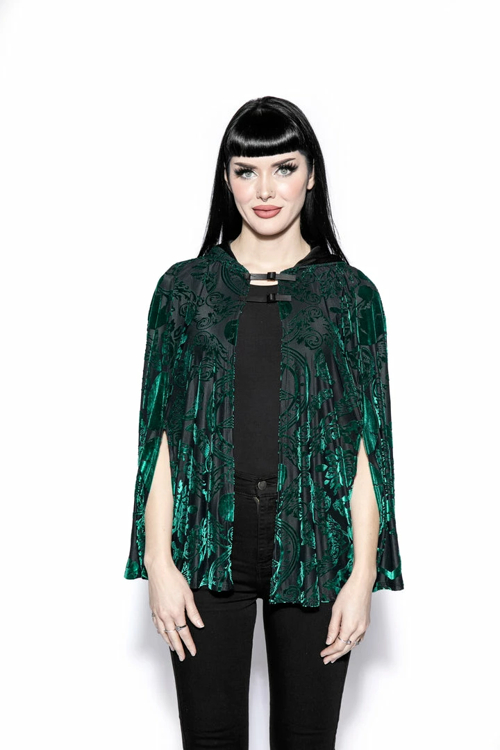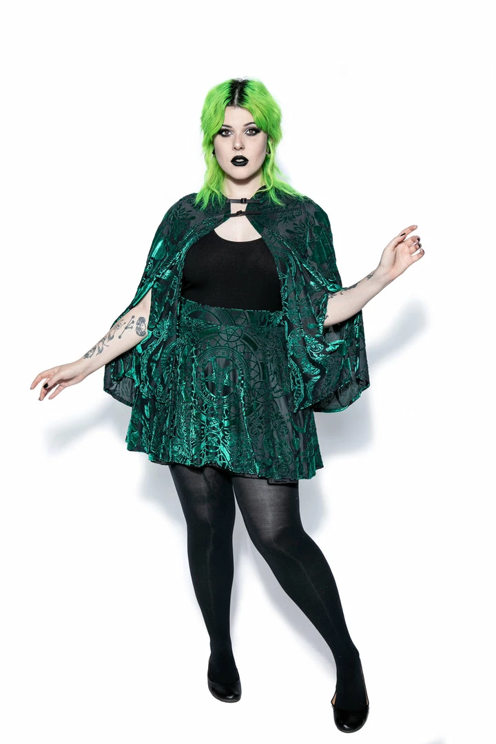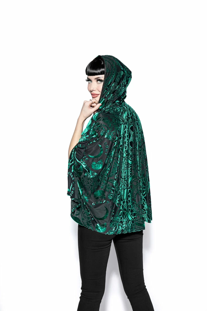 “Little Green Riding Hood” vibes. Part of the green velvet collection, the cape comes in a luxurious green baroque style with clasps to make the hooded cape look. It features arm holes to keep the shape of the cape while keeping you covered. It is soft to the touch with a slight stretch.
