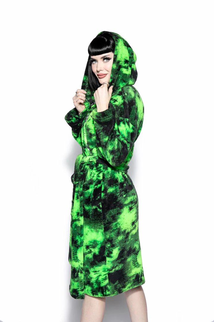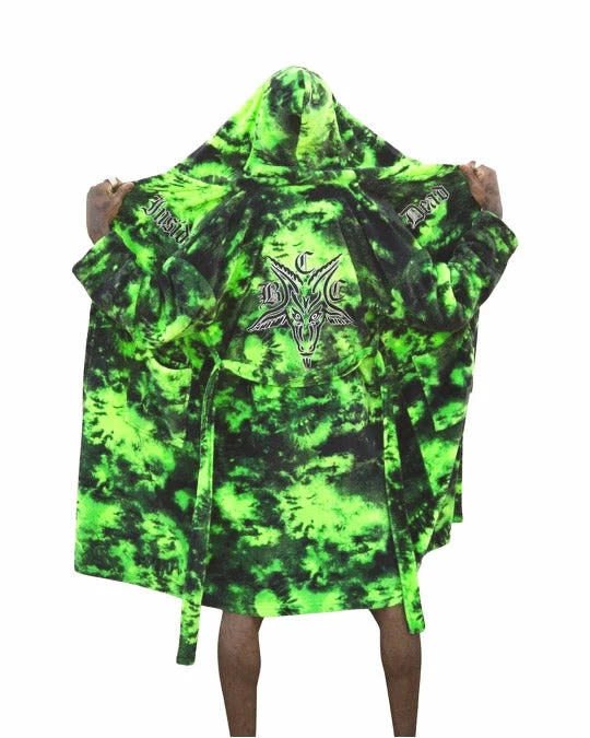 Unisex green lightning dye plush robe with hood. Features embroidered “Dead Inside” across the front, BCC Goat on the back, and two front pockets. Includes black ribbon inner tie for extra security as well as outer tie.