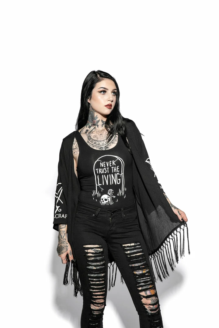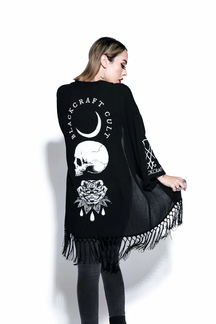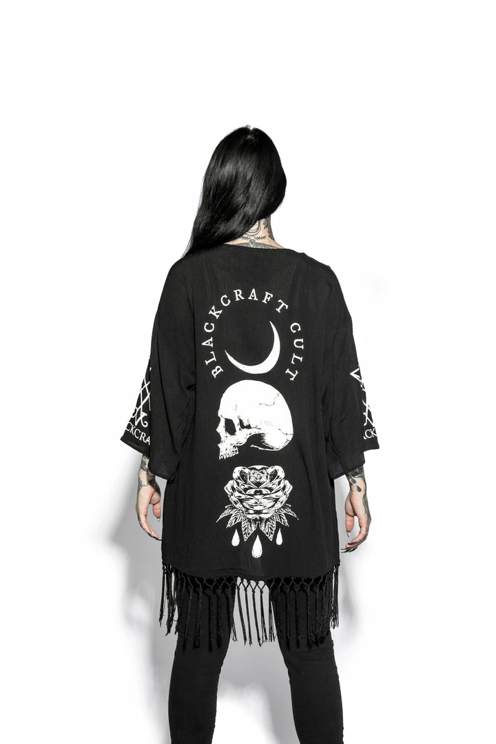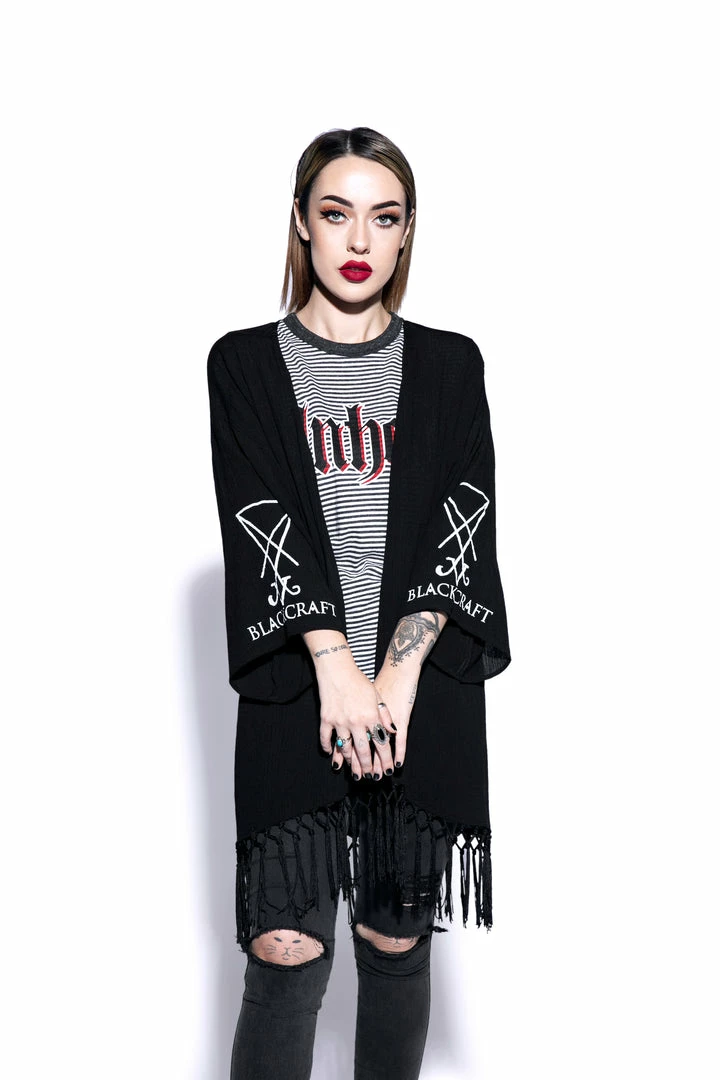 Women’s Oversized kimono with crochet fringe detail at bottom.