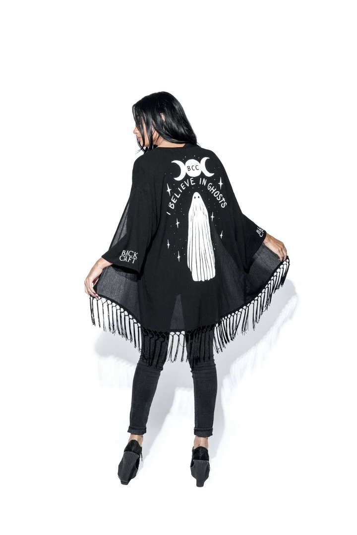 Women’s Oversized kimono with crochet fringe detail at bottom.