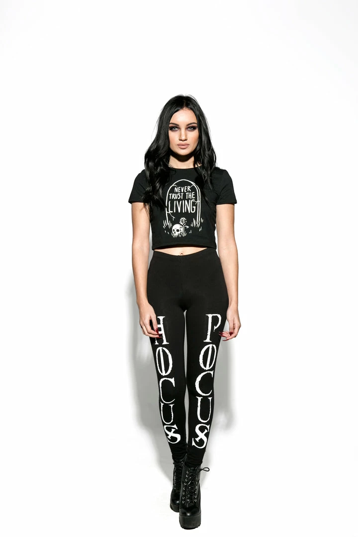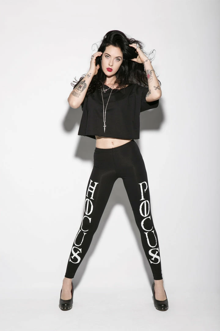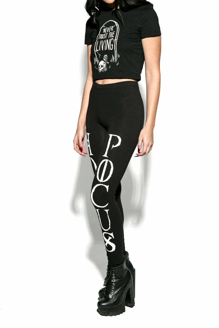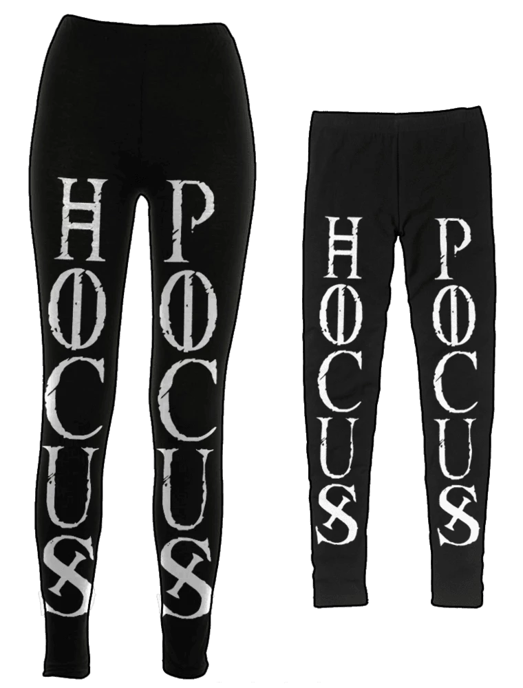 Women’s Leggings with Hocus Pocus print down the front of the legs.