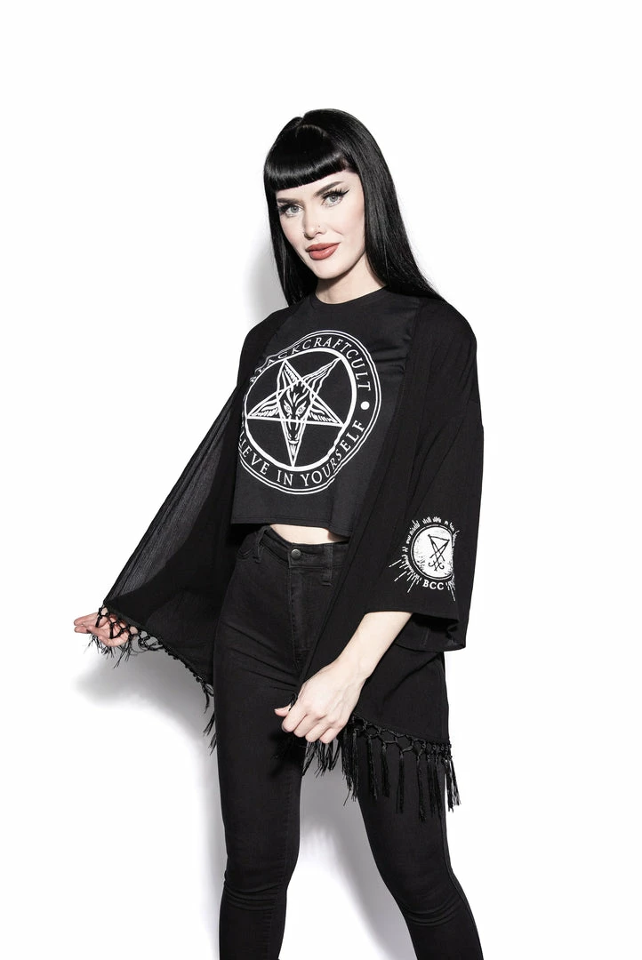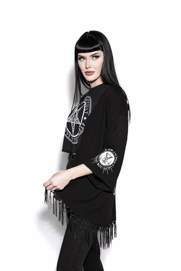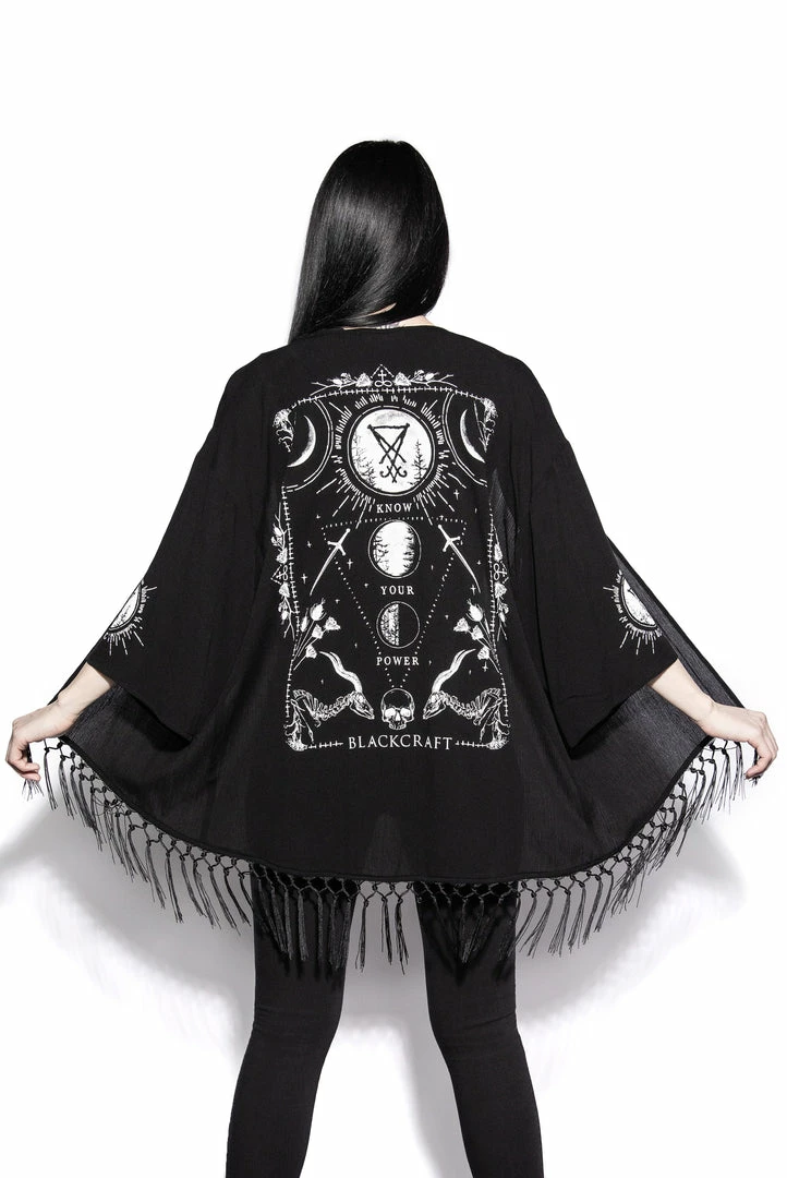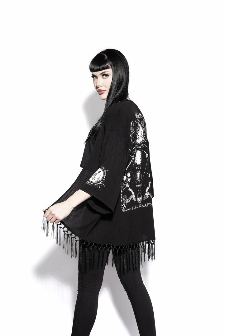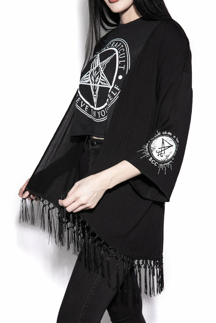 Women’s Oversized kimono with crochet fringe detail at bottom.