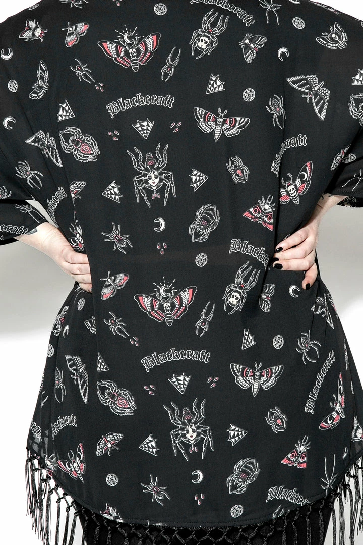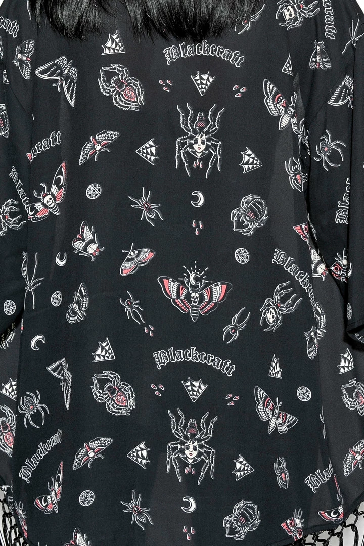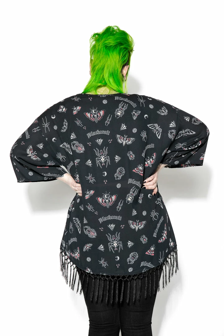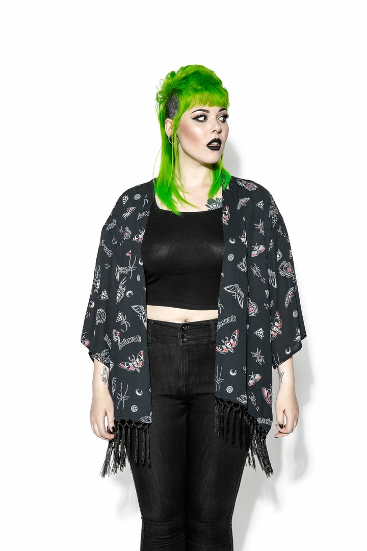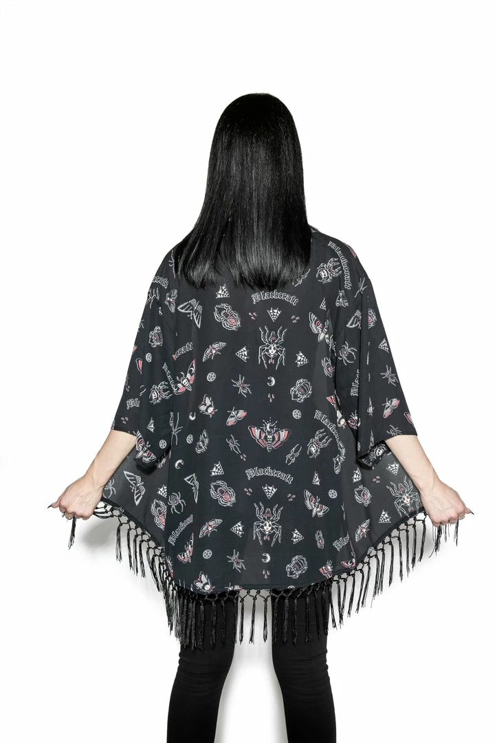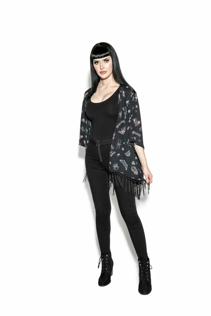 Women’s Oversized kimono with crochet fringe detail at bottom.
