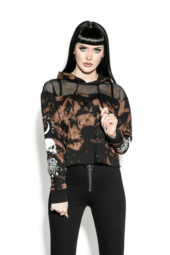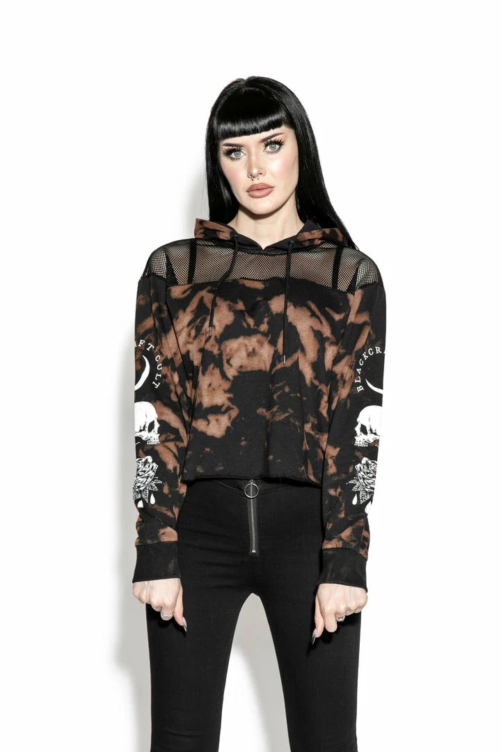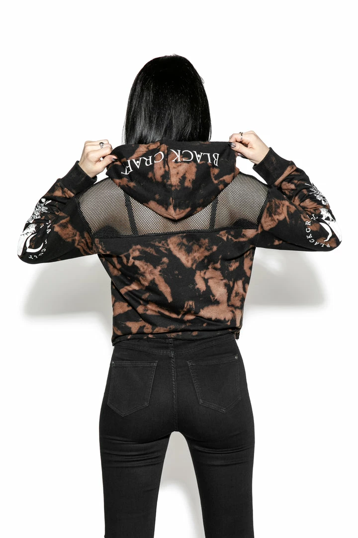 One of our best-selling cropped hoodies bleach washed for a tie dye effect. Mesh shoulders and Spirits of the Dead totem down both arms. Blackcraft logo detail across the hood.