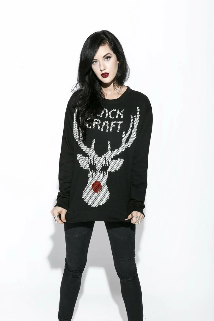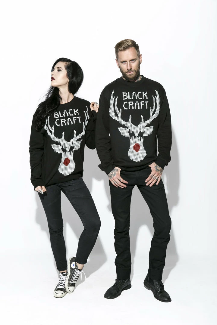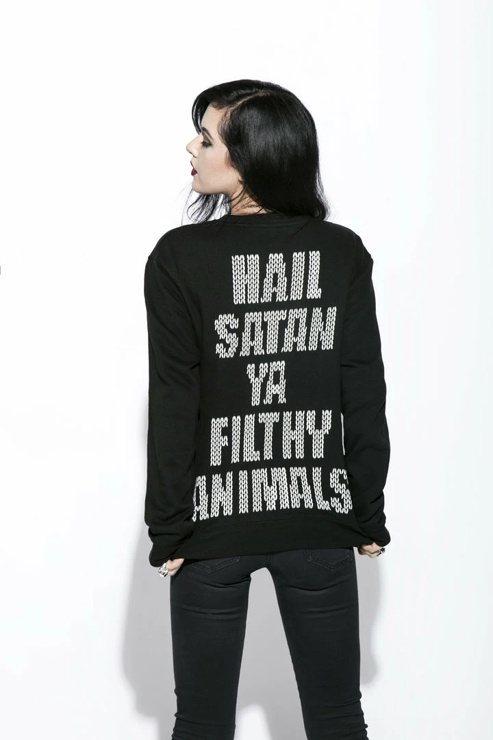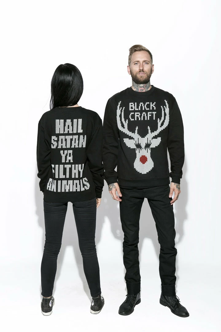 Screen printed Black Metal Rudolph on the front and “Hail satan ya filthy animals” screen printed on the back.