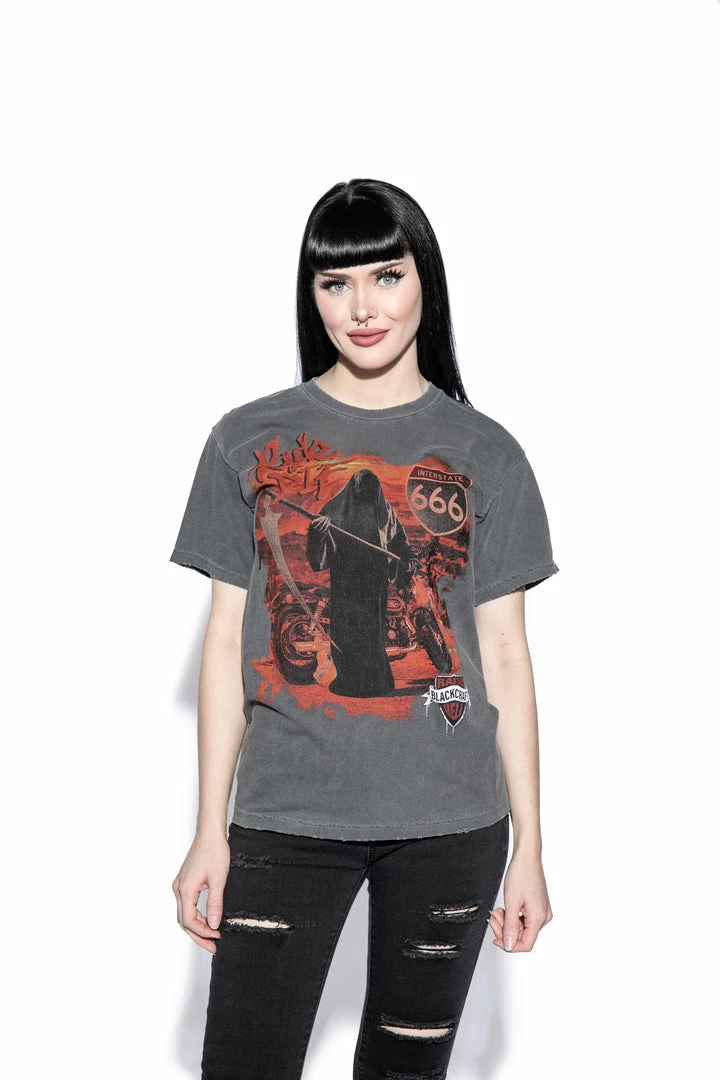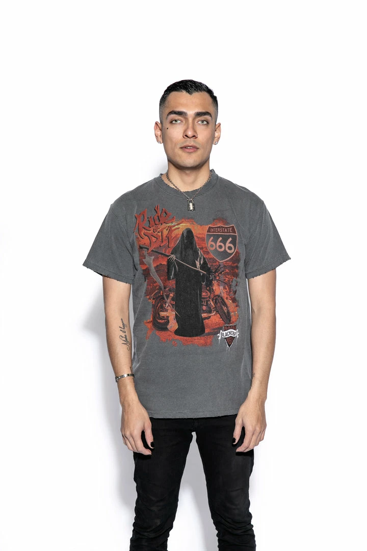 Tees are uniquely grinded at collar & all hems for a more vintage feel.