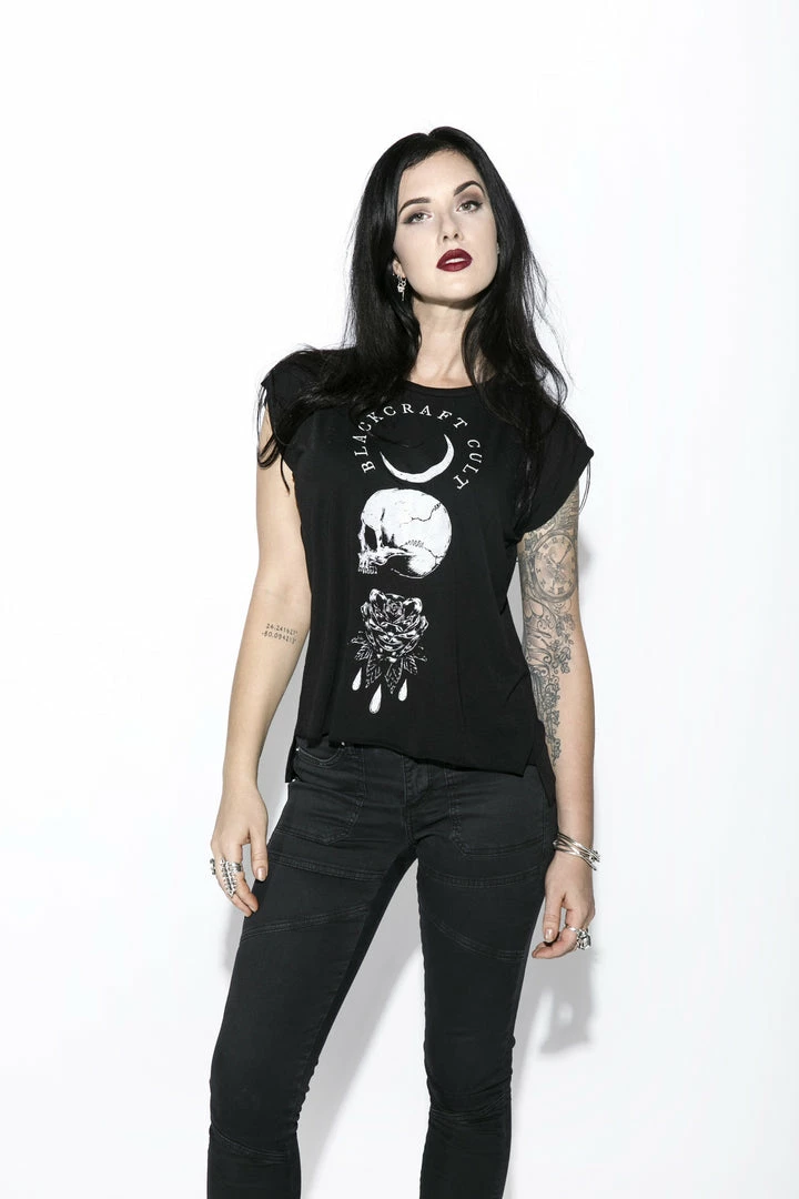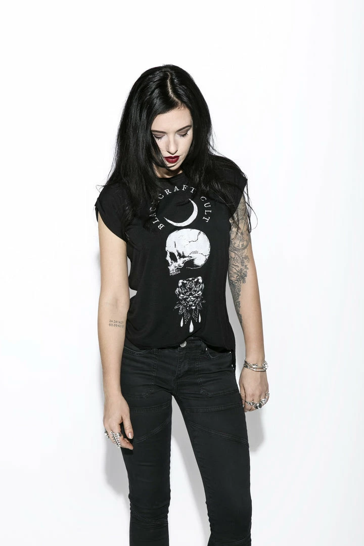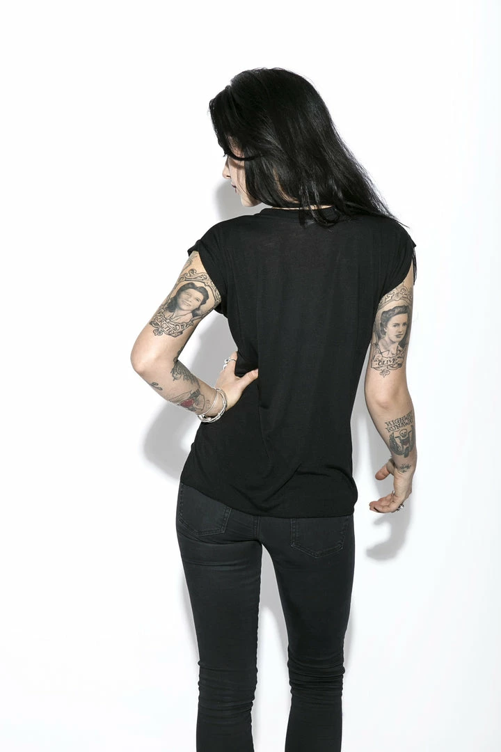 Women’s Flowy Muscle Tee 65% poly 35% viscose. Side seamed. Relaxed, draped fit. Rolled cuff. Hi low raw bottom hem.