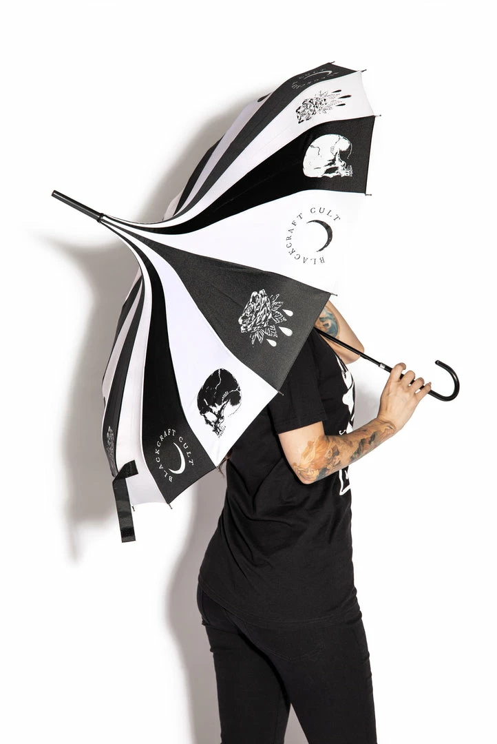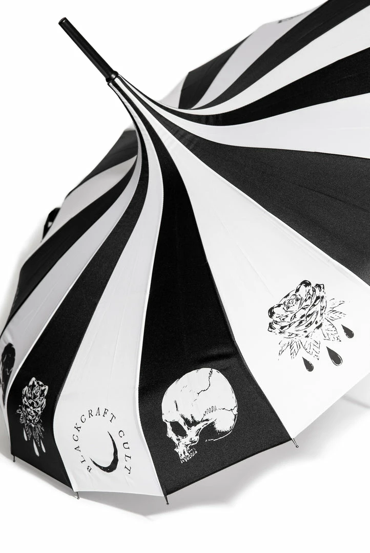 The perfect addition for any day, rain or shine. This black and white paneled parasol features Spirits of the Dead artwork all around the edges with a pointed peak. Includes strap for closure and curved handle.