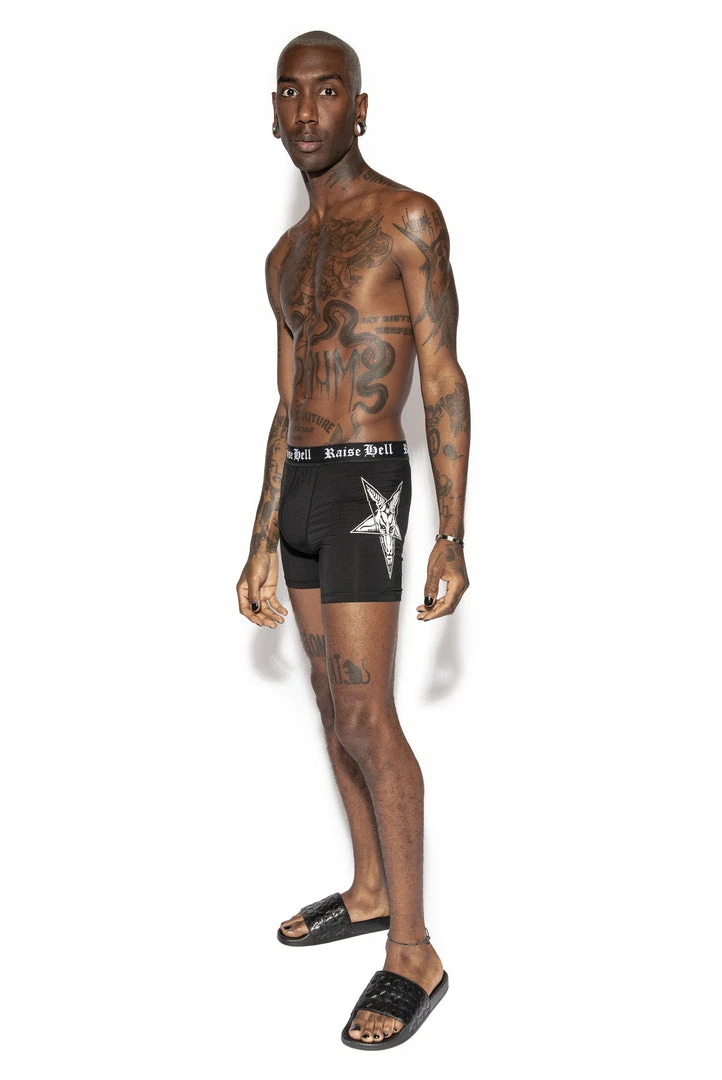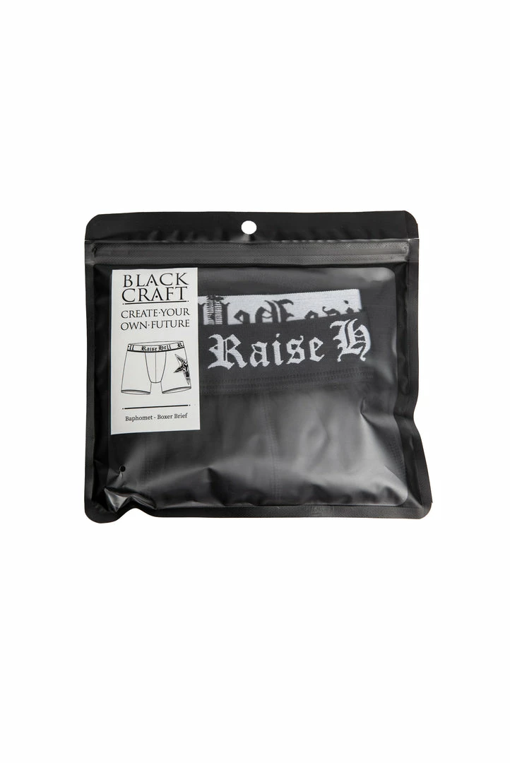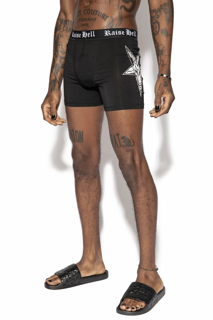 Our first collection of boxer briefs! This style features custom “Raise Hell” waistband and printed Baphomet on the side. Soft to the touch and designed to be fitted on the body with a front pouch for extra comfort.Â