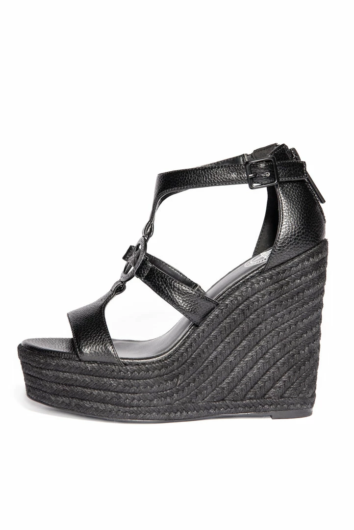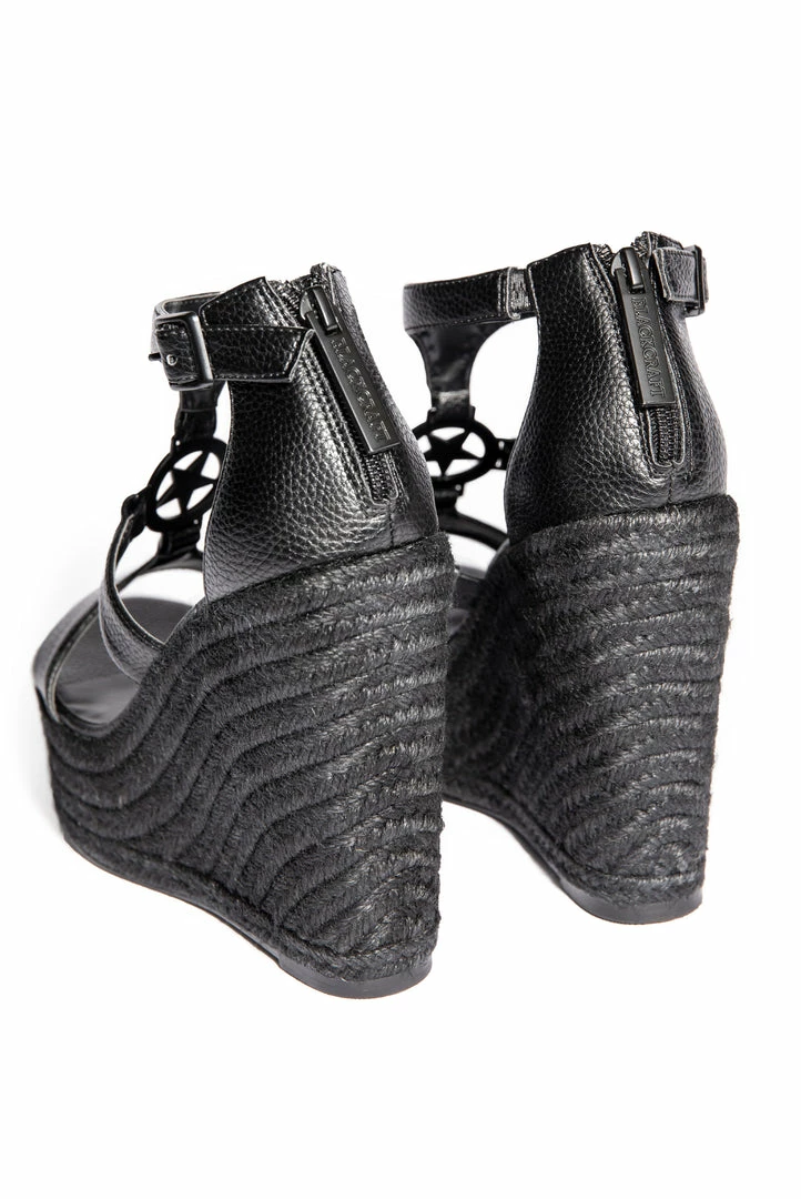 Step into luxury with our all black espadrille wedges. Features Believe in Yourself matte black hardware and faux leather body.