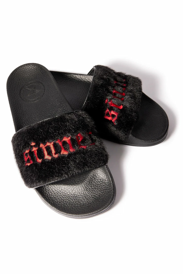 Premium quality pool slides with faux fur strap with sinner embroidery.