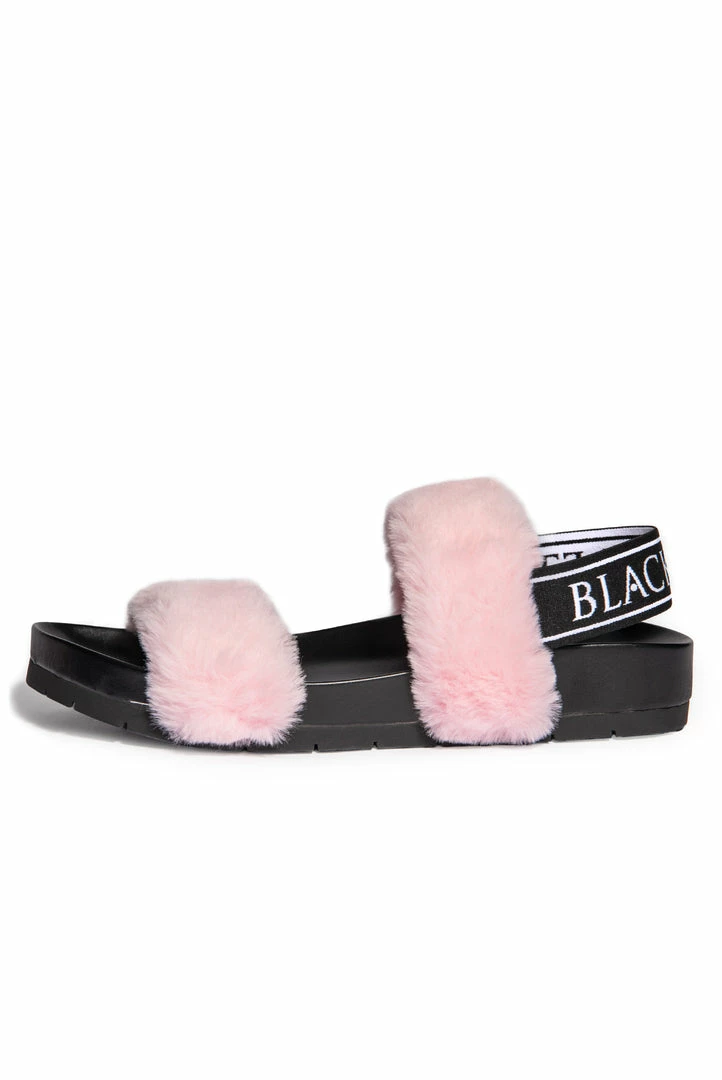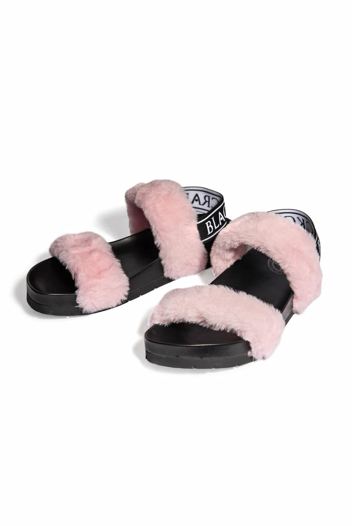 Channel your inner goth princess with these double strap, faux fur slides. Features logo tape back strap for secured comfort.