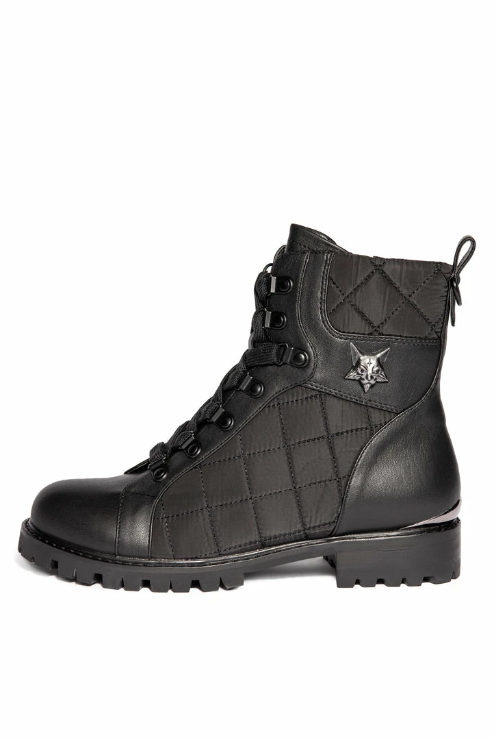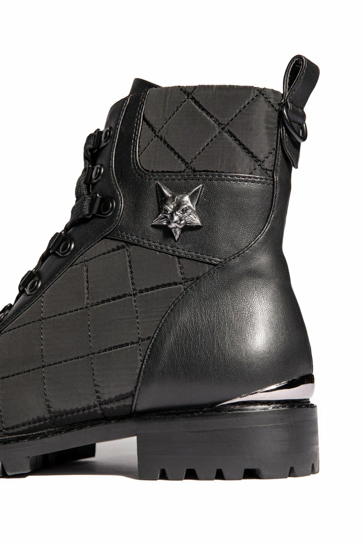 Combat boots for any occasion. The boot features mixed materials of smooth PU leather and quilted nylon. Has a zipper closure and laces with matte black hardware. Stunning new Hell Cat hardware in antiqued silver on the side and gunmetal accent on the heel.