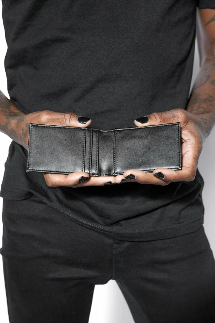 Baphomet embossed, faux leather front pocket wallet. Features 4 internal card slots/pockets and 3 external card slots/pockets and 1 external ID slot.