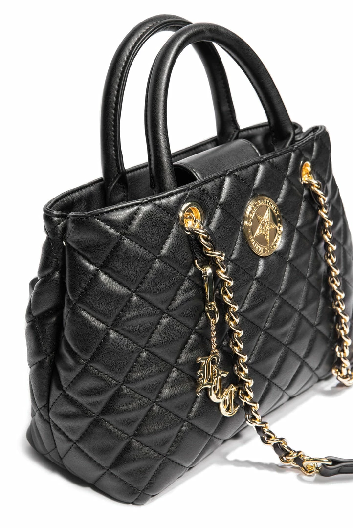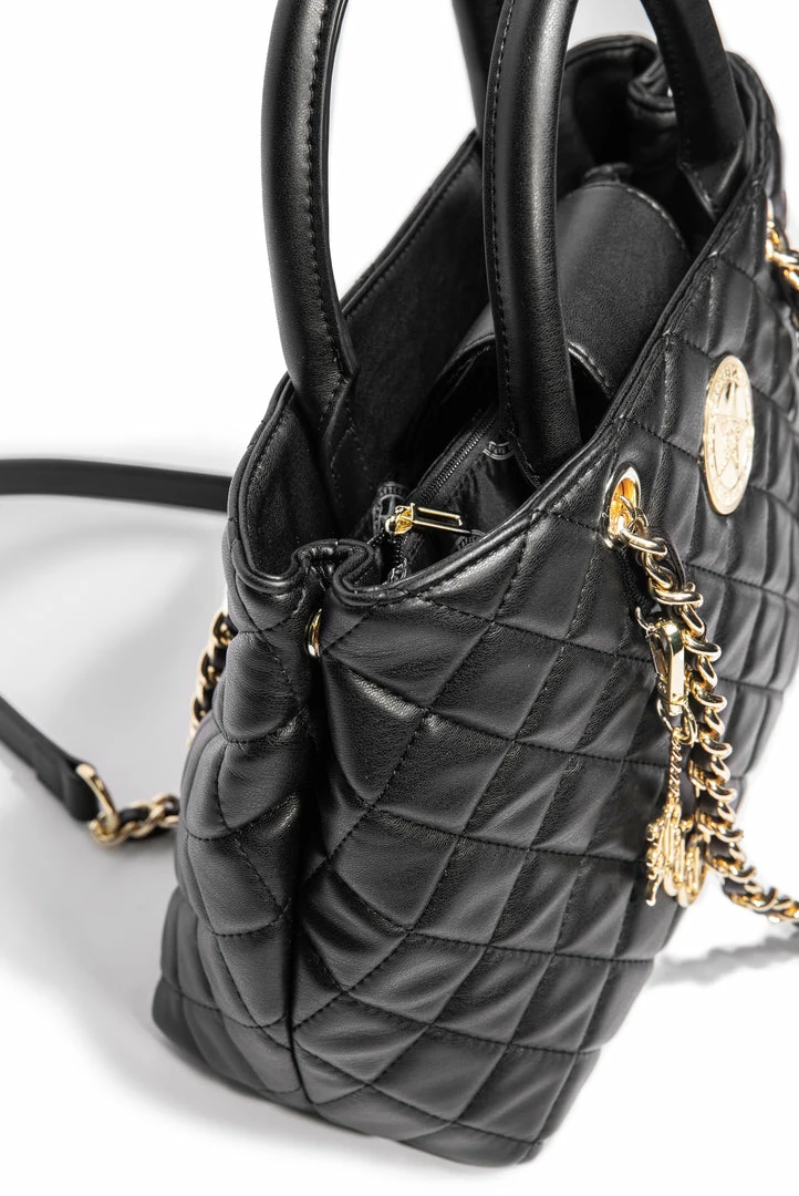 Black quilted satchel with magnetic closure. Features gold hardware, BCC keychain, and exterior zip pocket. Includes chain and leather straps and handles.