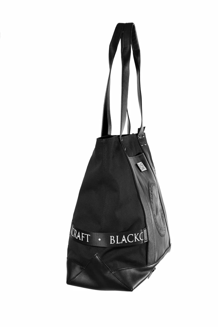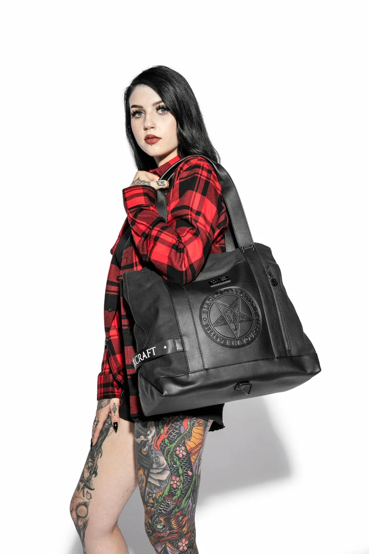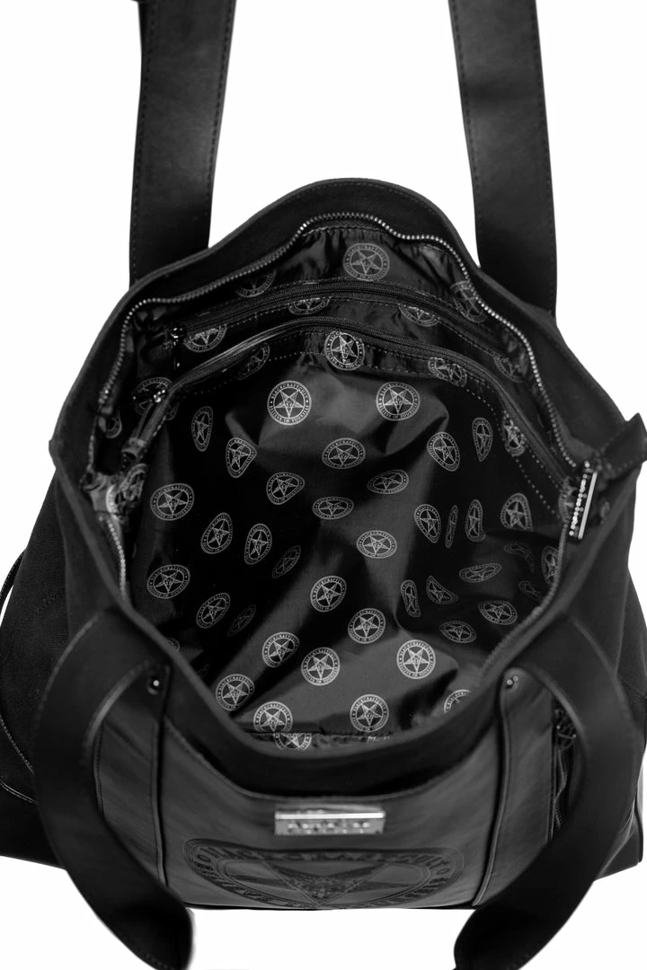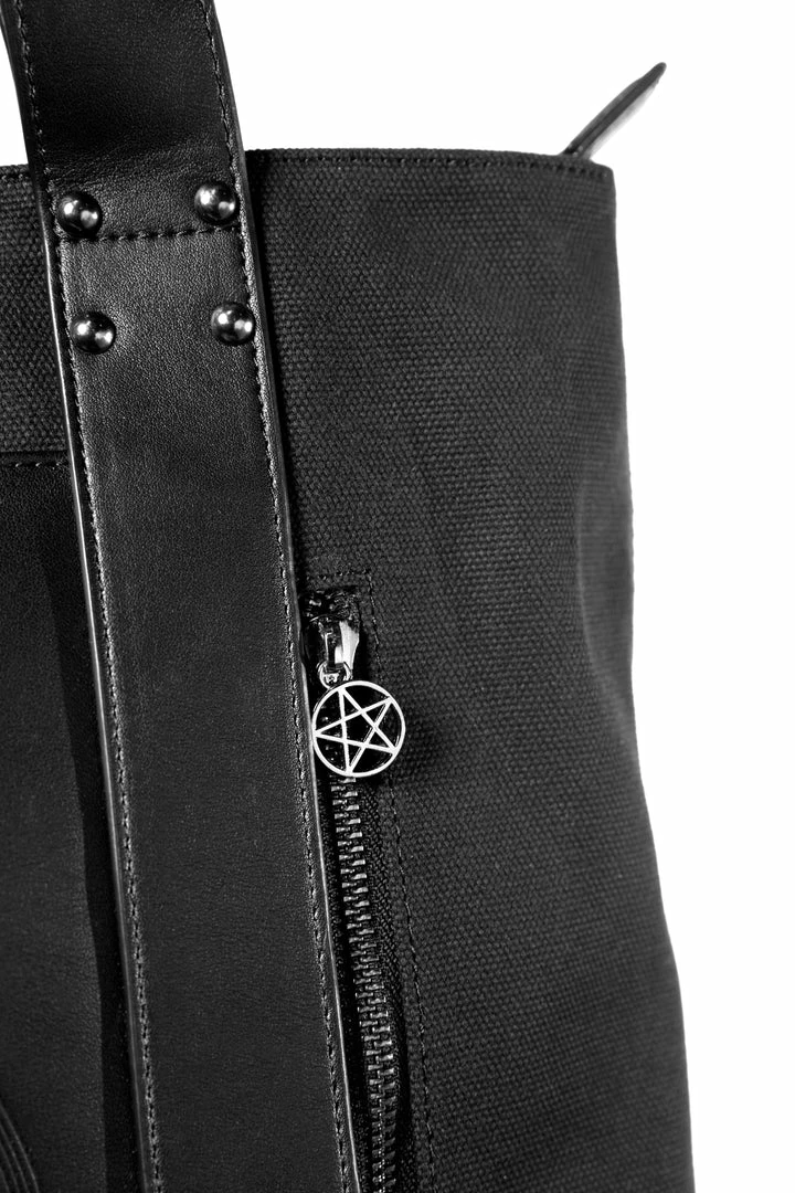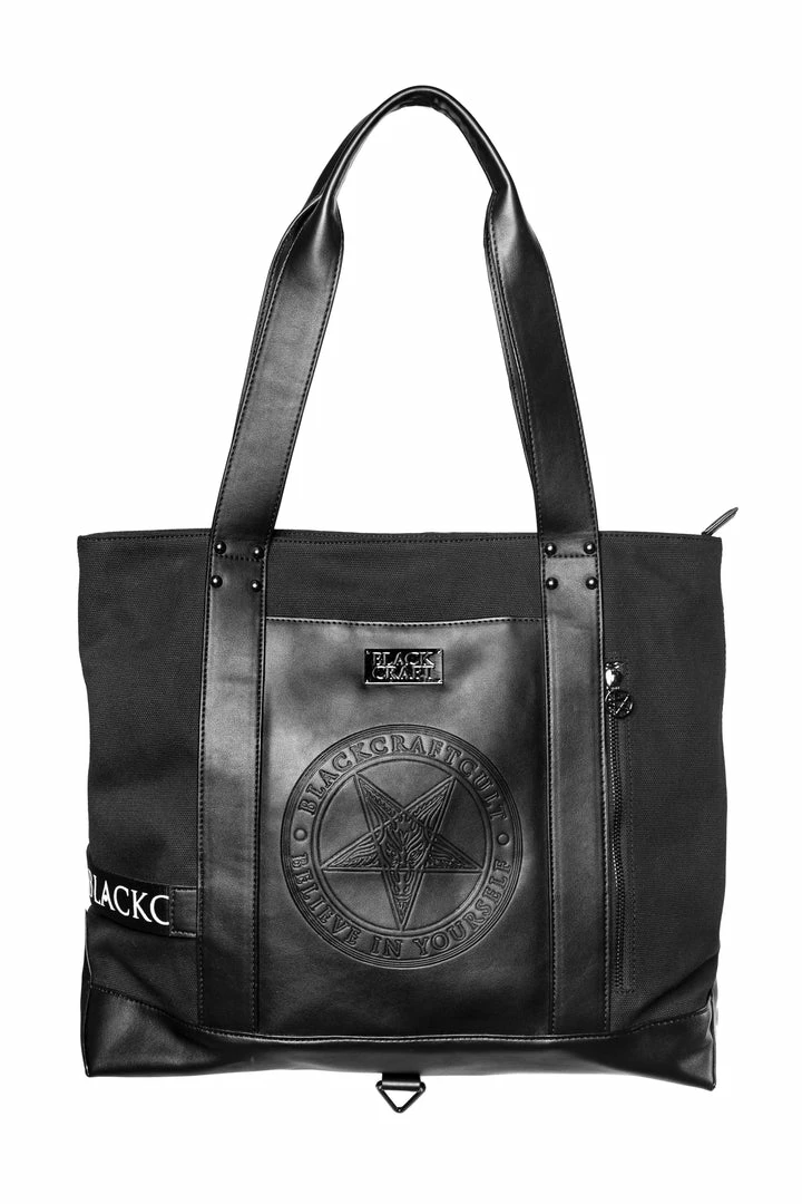 Canvas Tote features black faux Leather detail with embossed Believe In Yourself Logo. Features gunmetal finish pentagram zipper pull and Blackcraft logo plaque.