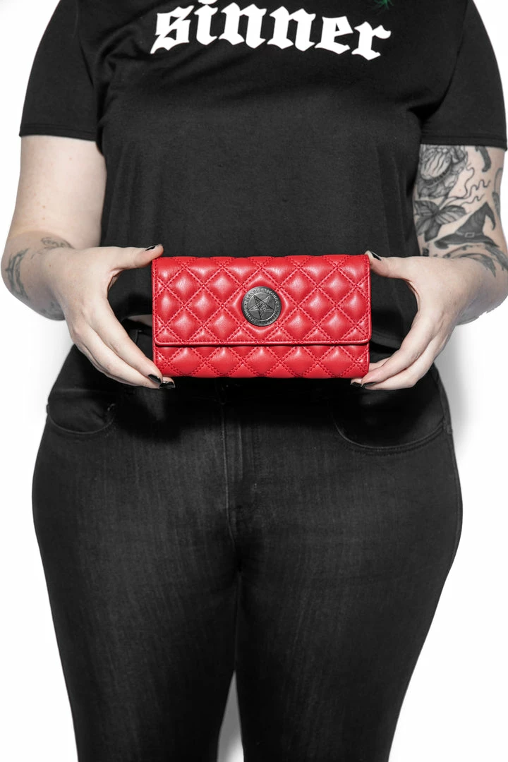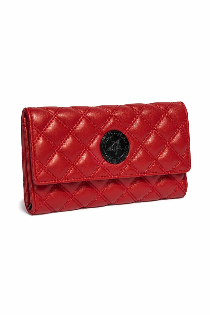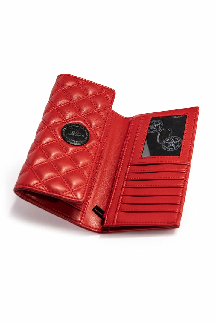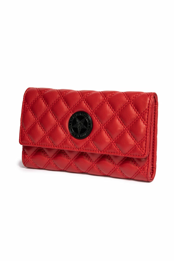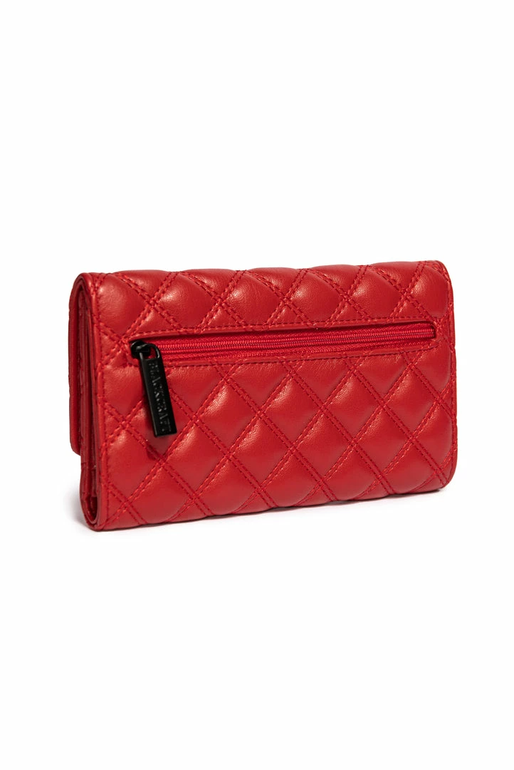 Faux leather slim clutch wallet features quilted design with matte black hardware. Includes 15 credit card slots, interior pockets, zip pockets.