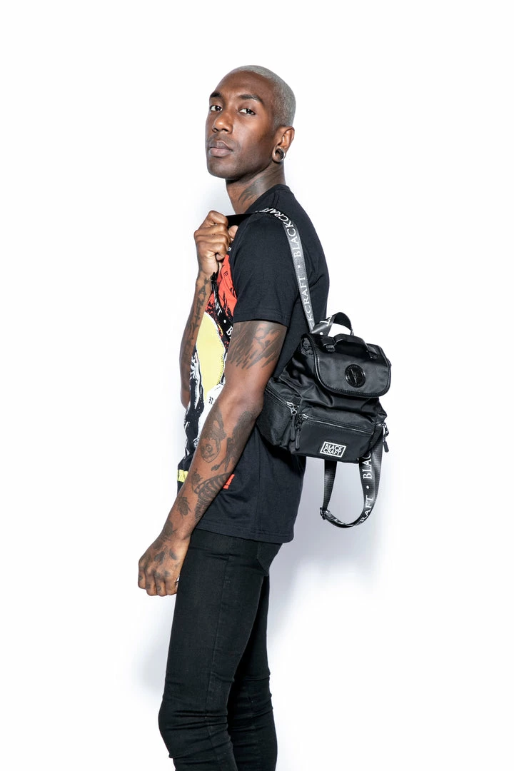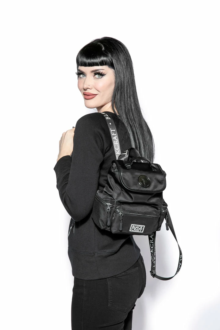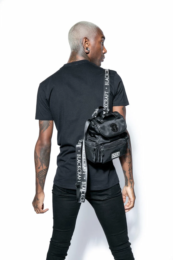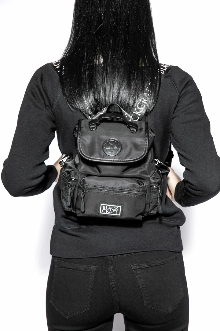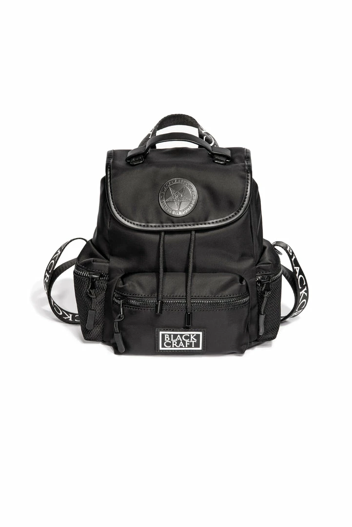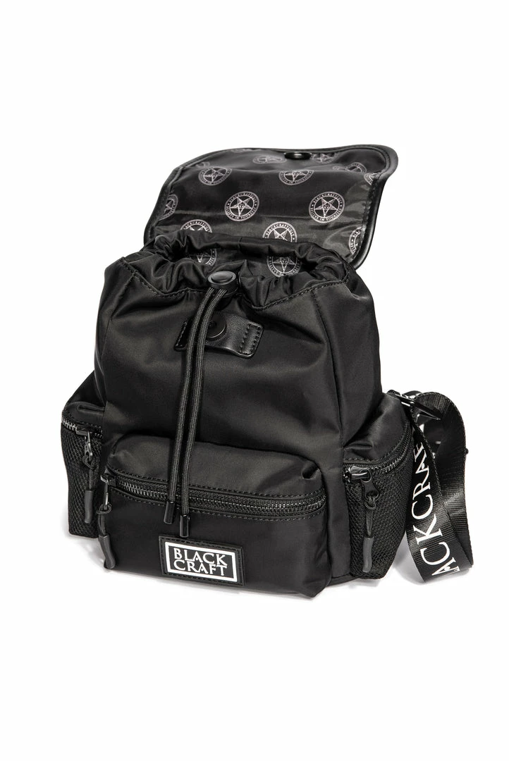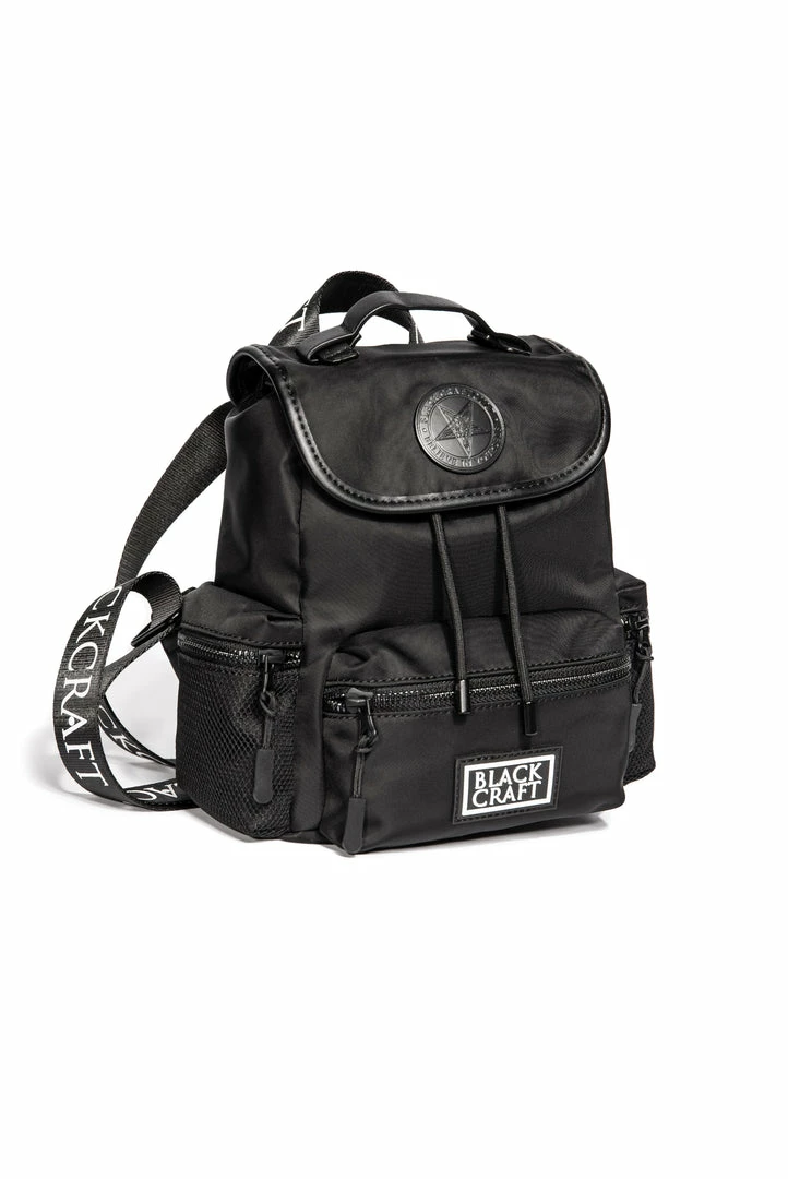 Nylon mini backpack with drawstring closure. Adjustable Blackcraft straps and faux leather details. Includes 3 small outer pockets with zip closure and 3 interior pockets with 1 zip closure. Features custom interior lining and Blackcraft logo hardware.