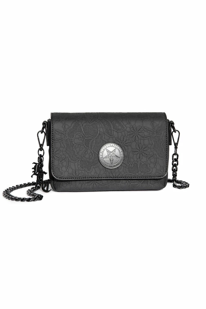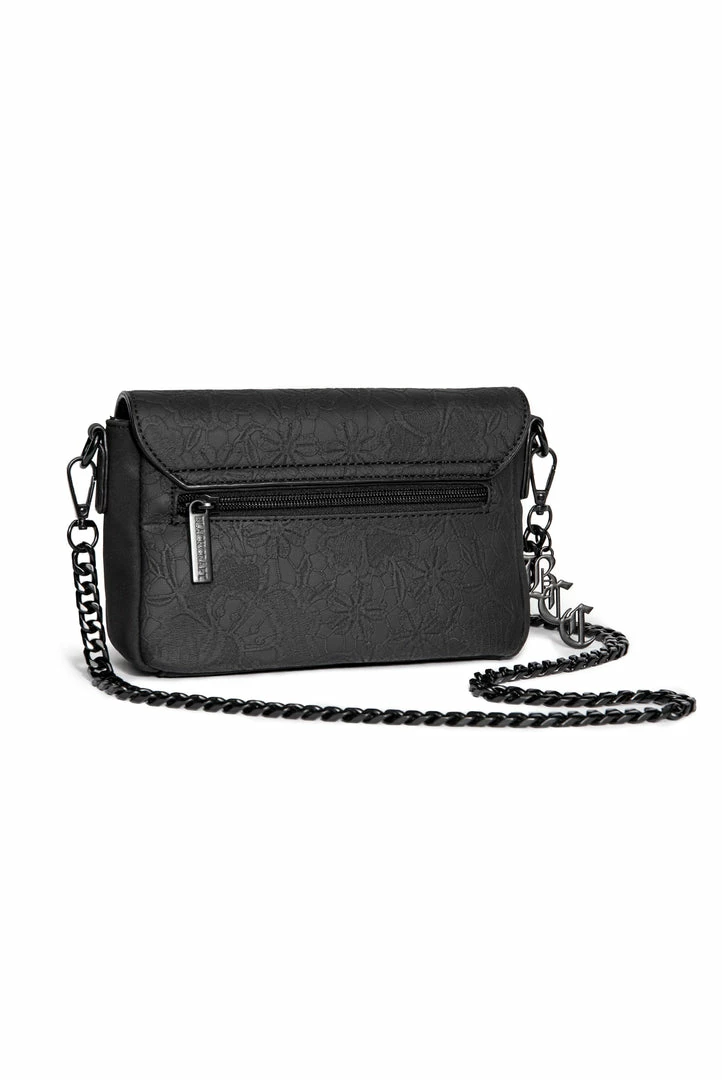 Dyed faux suede crossbody bag with PU leather floral overlay and crossbody strap. Features Believe in Yourself matte black logo hardware and flap closure.