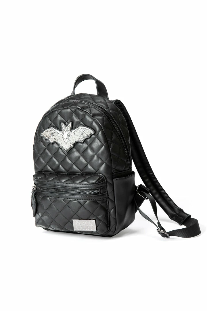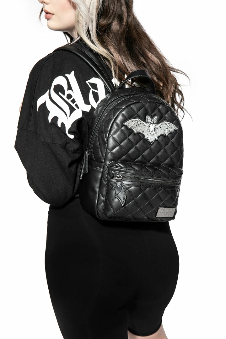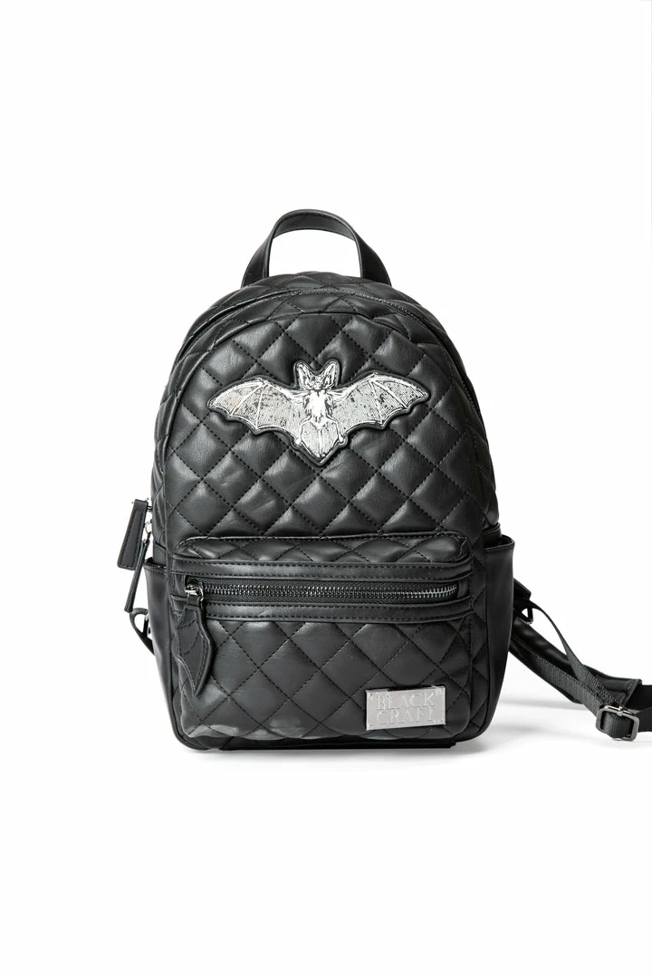 Faux leather quilted backpack with bat patch on the front. Includes top zipper and front pocket zipper. Features Blackcraft hardware and custom lining.