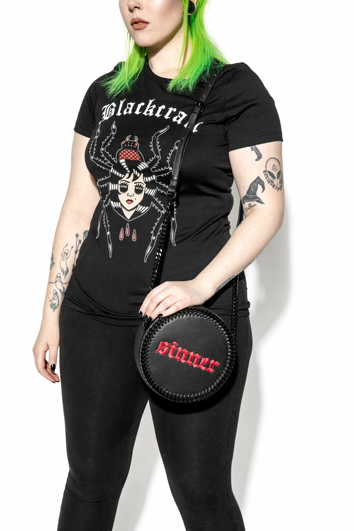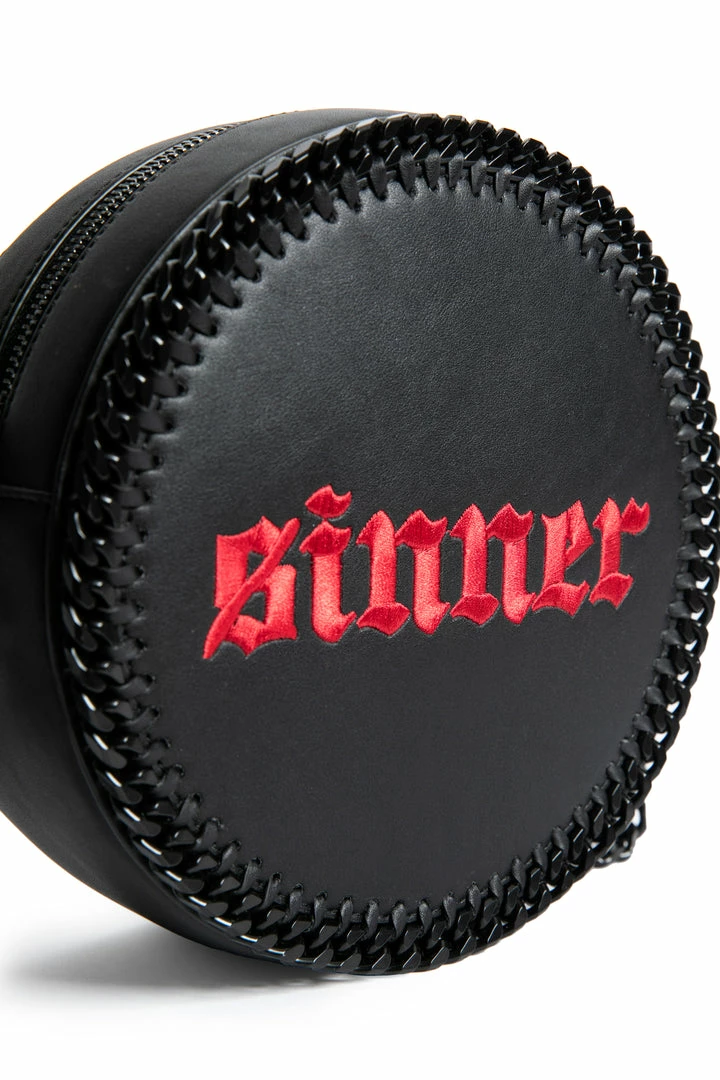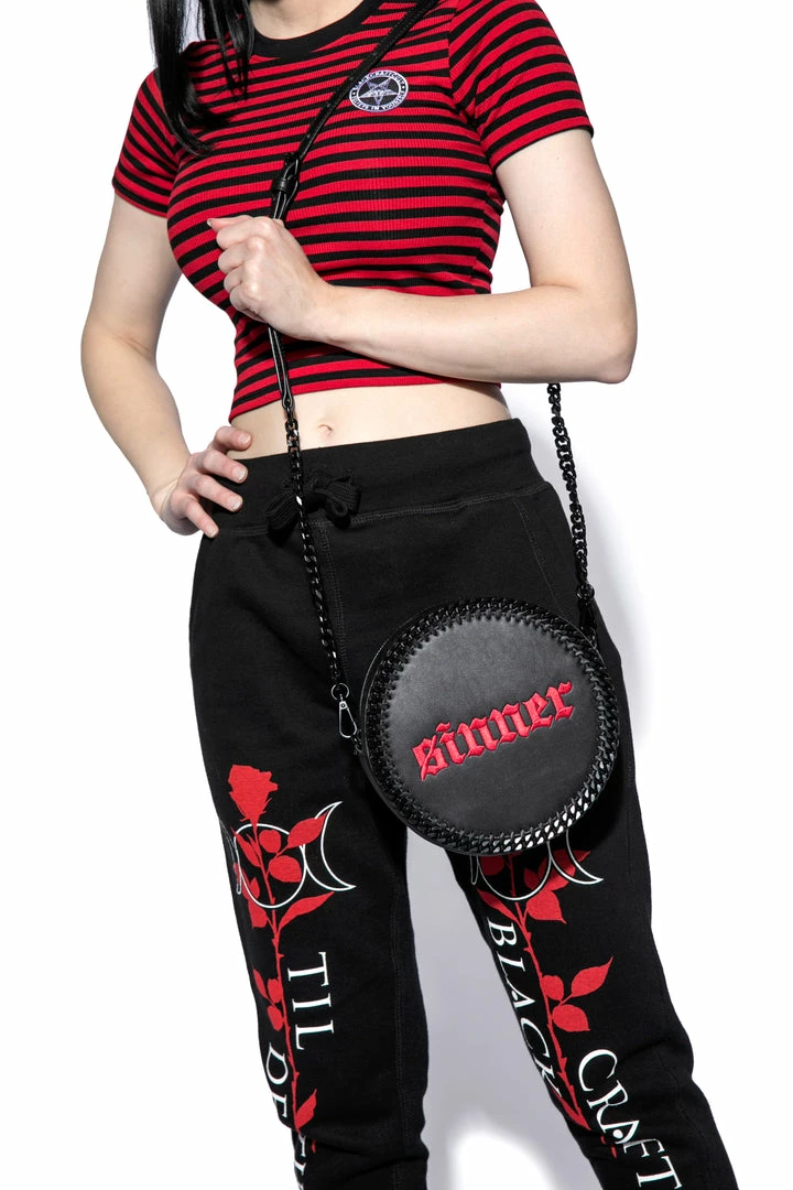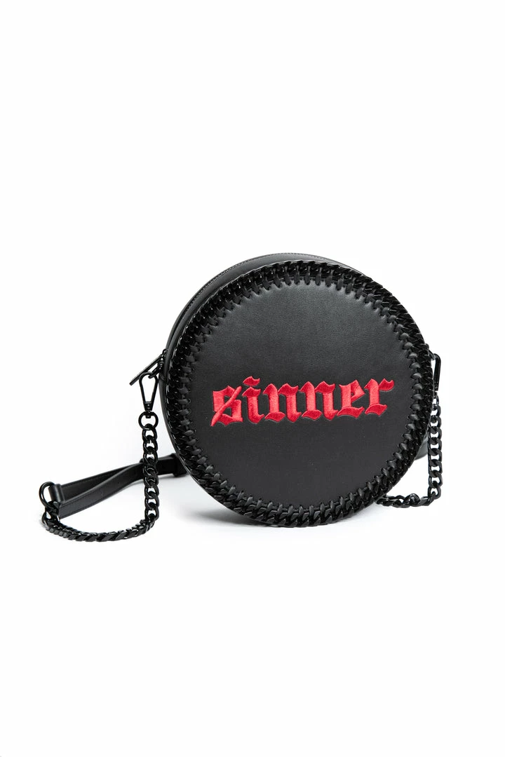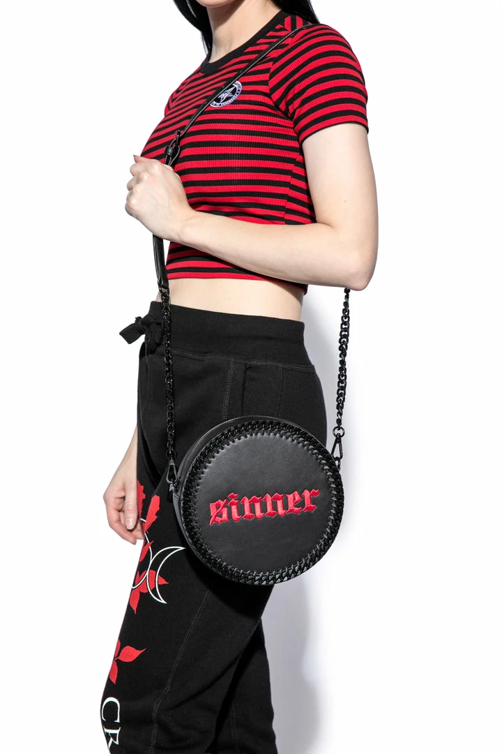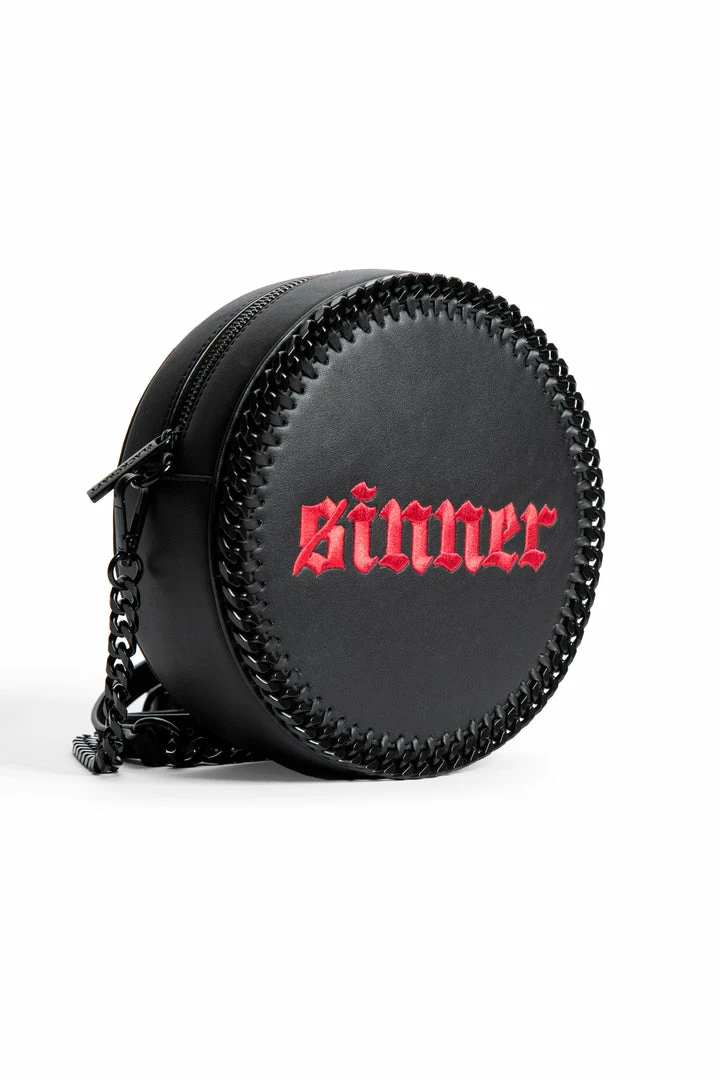 Faux leather crossbody with gunmetal finish hardware and features an adjustable chain strap. Chain detailing on the front face of the bag along the border with red sinner embroidery. Custom interior print lining.
