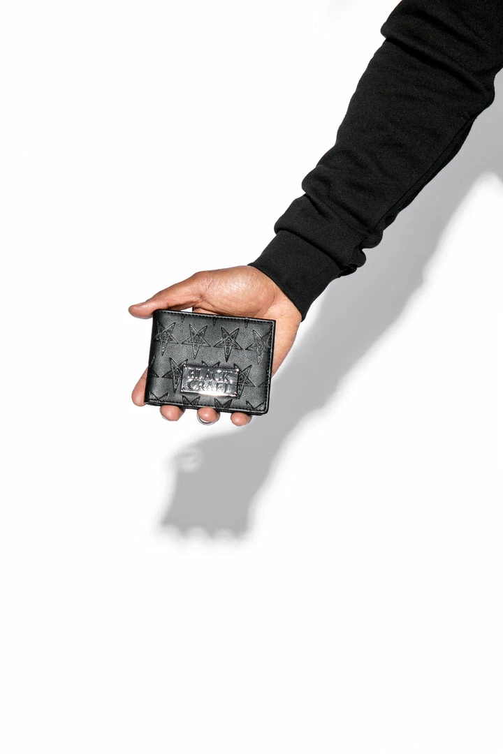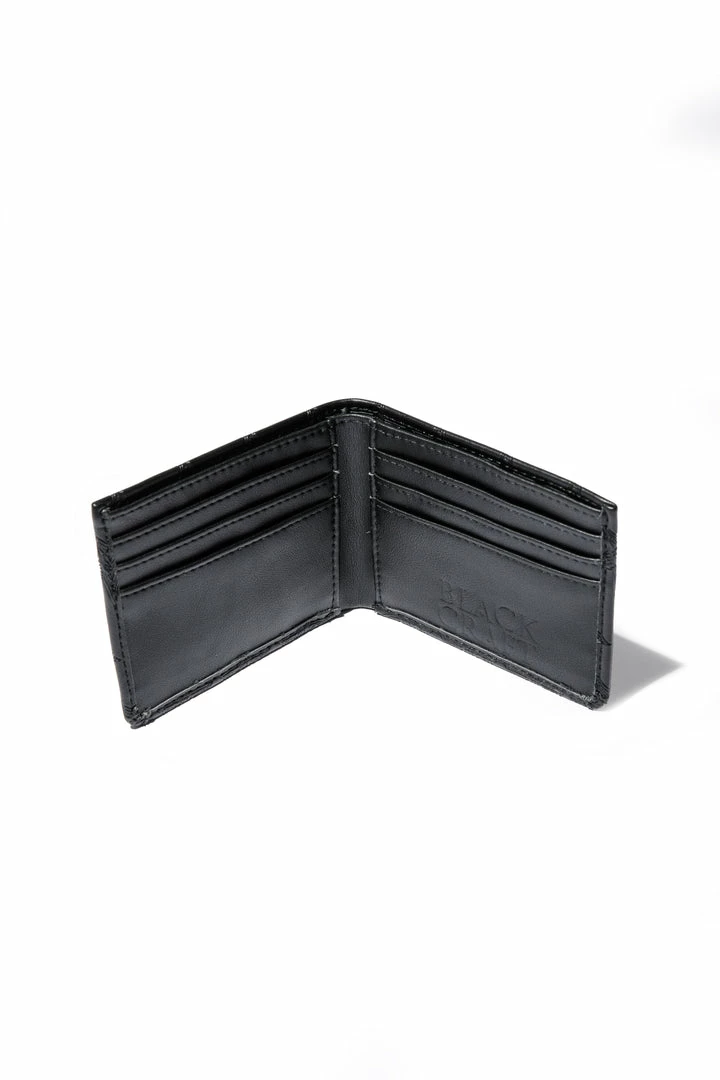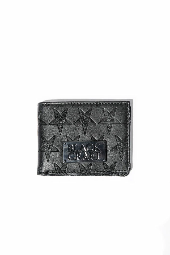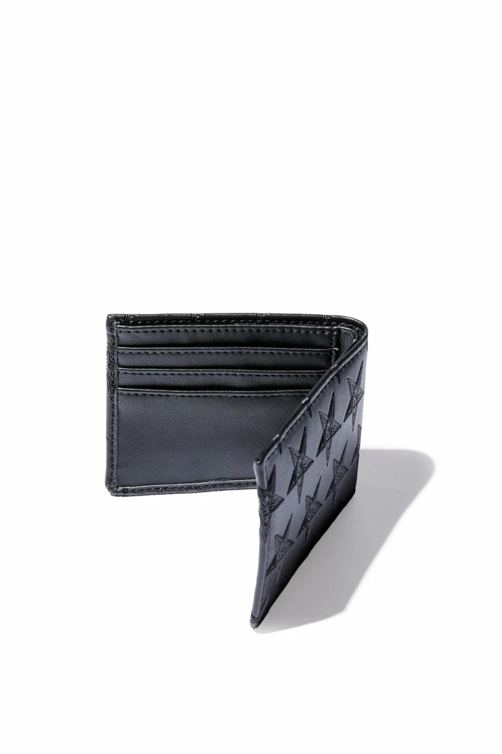Faux leather bi-fold wallet with 6 credit card slots and bill compartment. Allover embossed baphomet print and gunmetal finish logo plaque hardware.