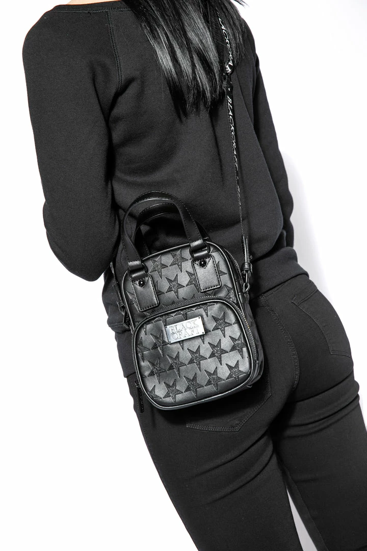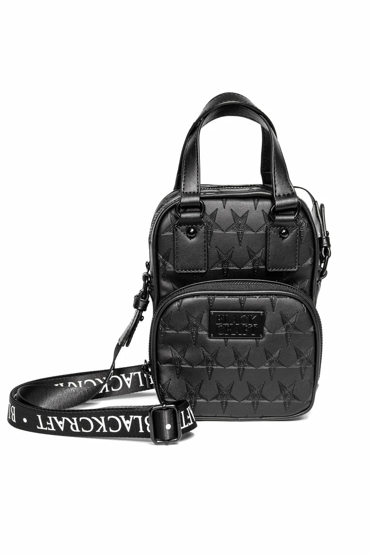 Faux leather carryall embossed with allover baphomet print. Gunmetal finish logo zippers and logo plaque. Adjustable strap