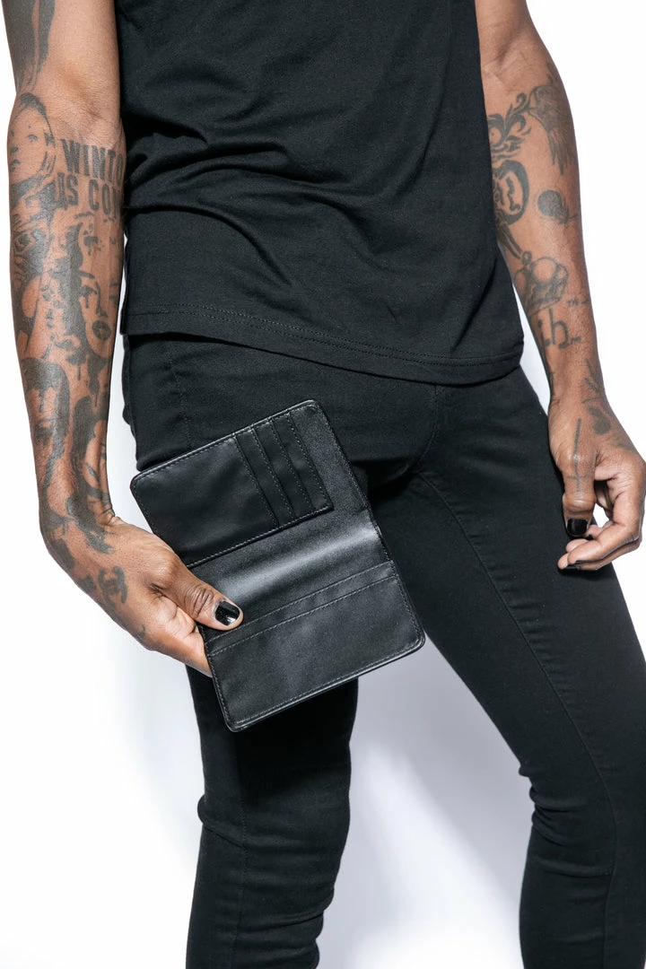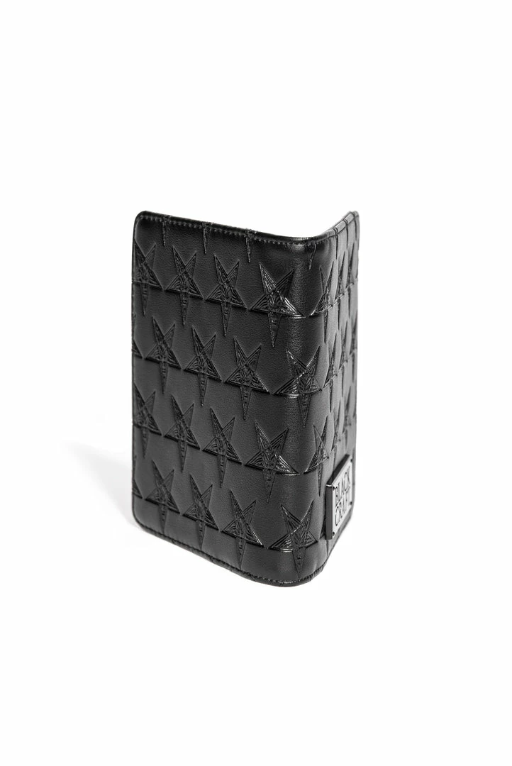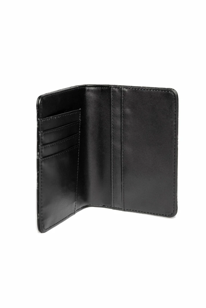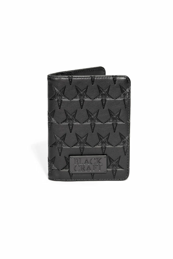 Faux leather bi-fold passport case with 3 credit card slots and bill compartment. Allover embossed baphomet print and gunmetal finish logo plaque hardware.