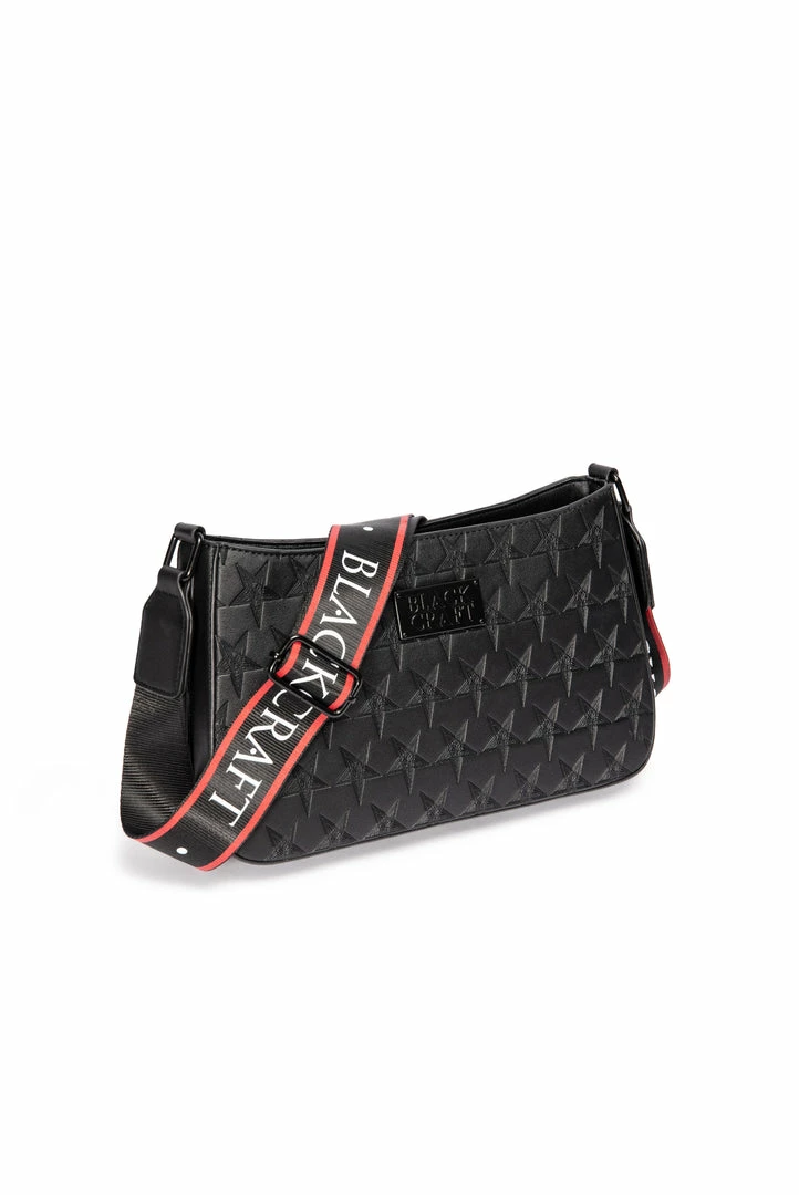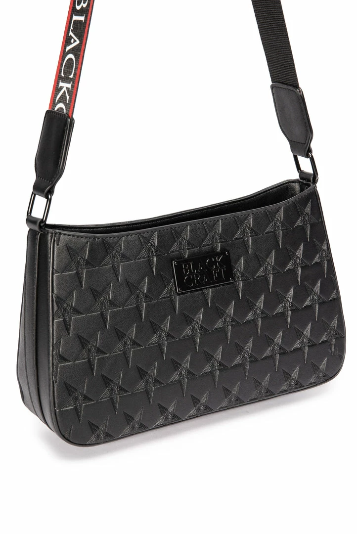 Top handle Baphomet embossed bag with adjustable logo strap. Can be used as crossbody. Features top zipper and back zipper pocket.