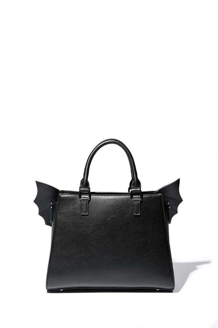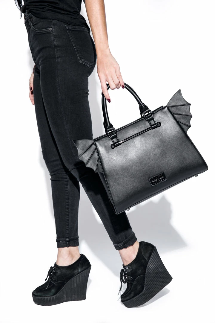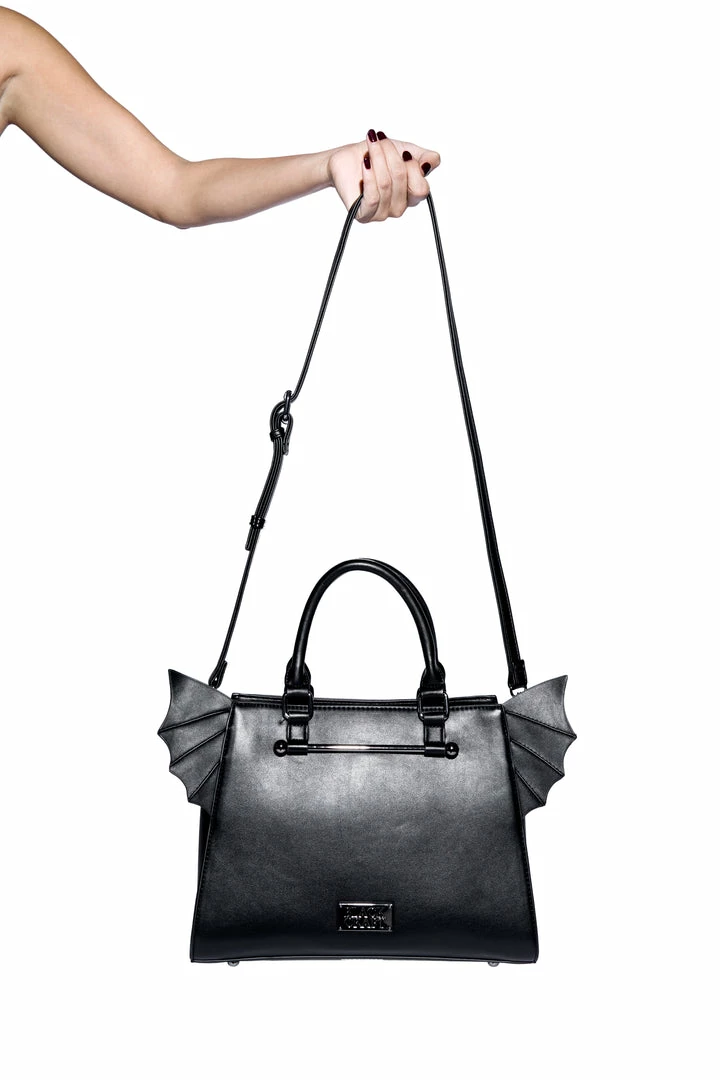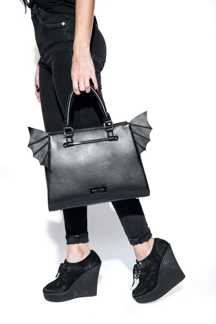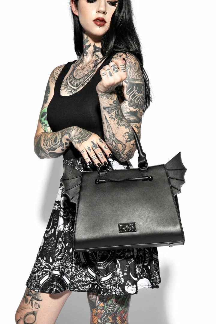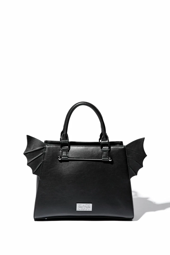 Faux leather bat wing satchel. Gunmetal finish Blackcraft logo zipper and metal plaque. Features detachable long crossbody strap as well as custom print interior lining.