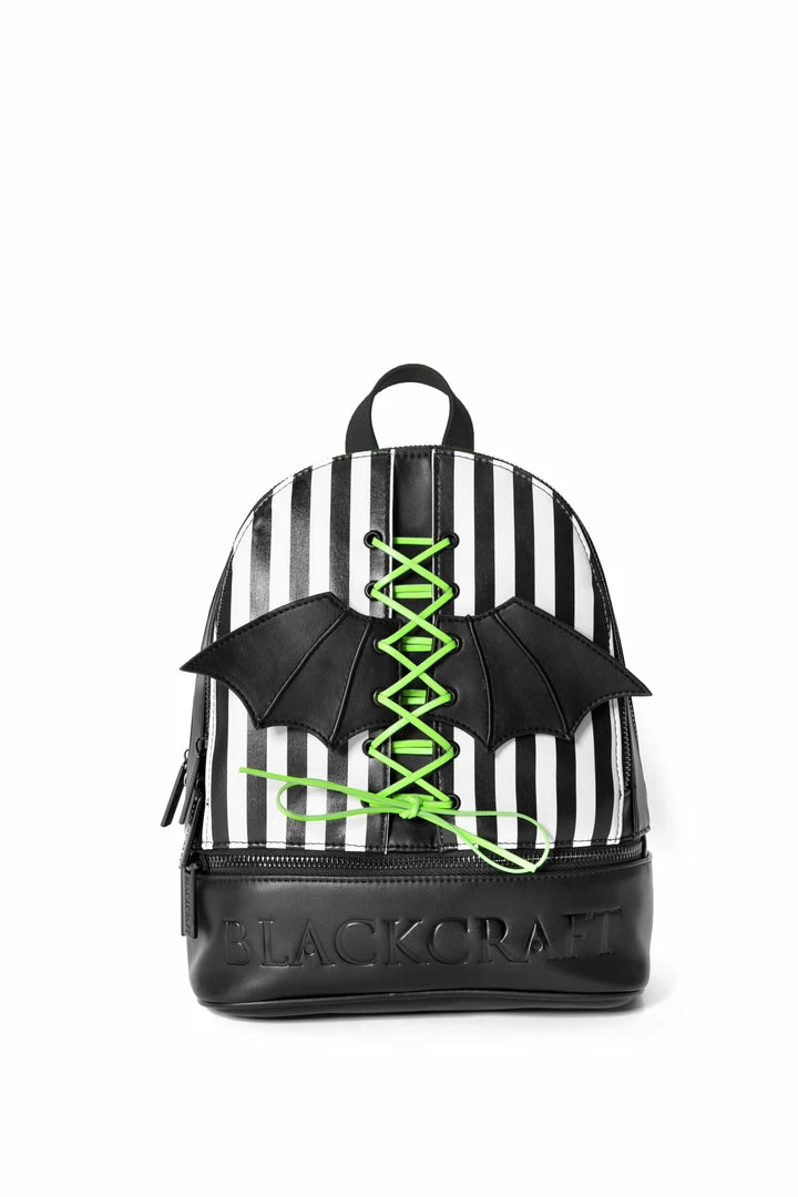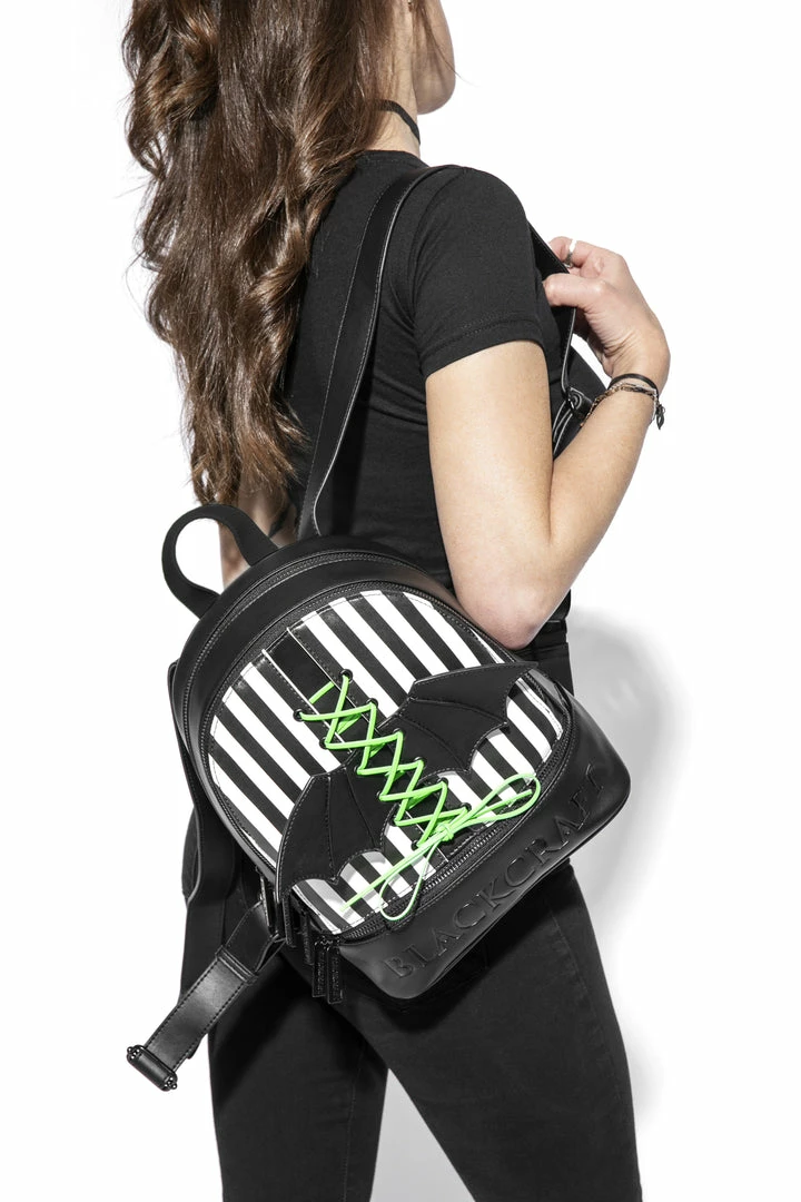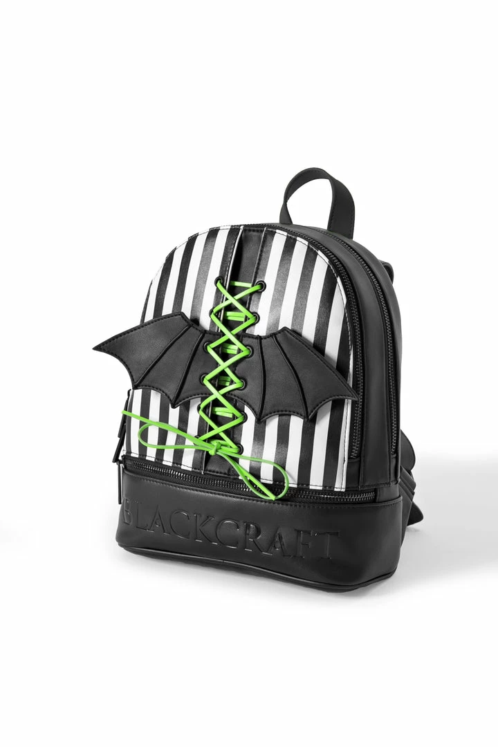 Faux leather medium sized backpack. Lace up 3D bat wing on front. Adjustable straps with gunmetal finish Blackcraft zippers. Interior features 1 zip pocket, 1 slit pocket and custom interior lining