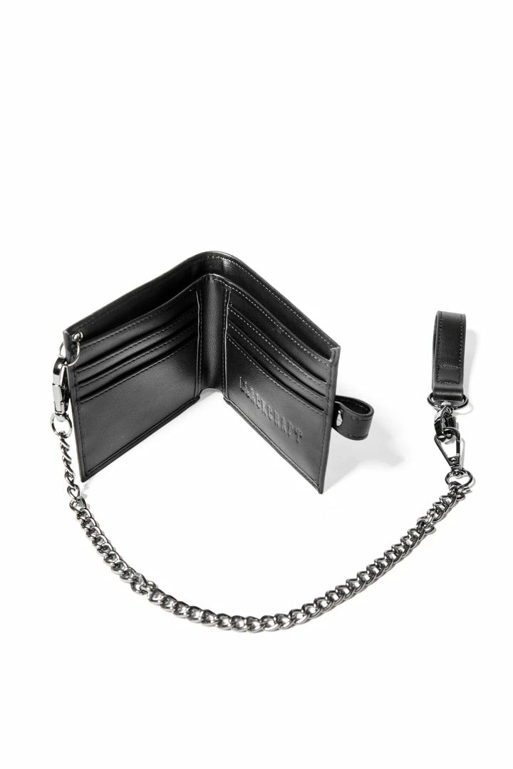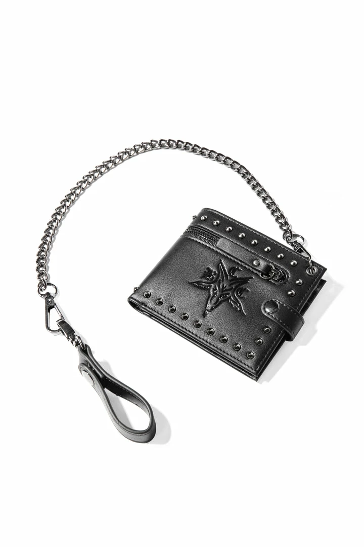 Faux leather bifold wallet with 6 card slots and bill compartment. BCC goat logo embossed on front. 18″ gunmetal finish chain that attaches to belt loop. Zipper, studs and chain in gunmetal finish.