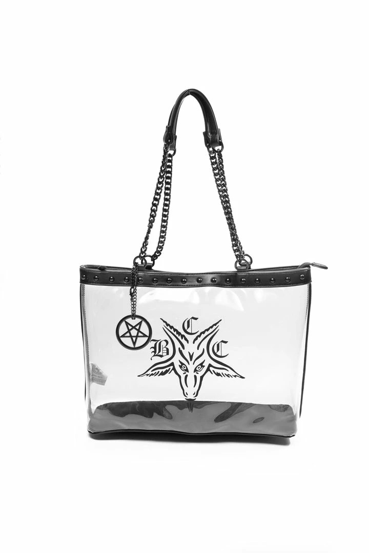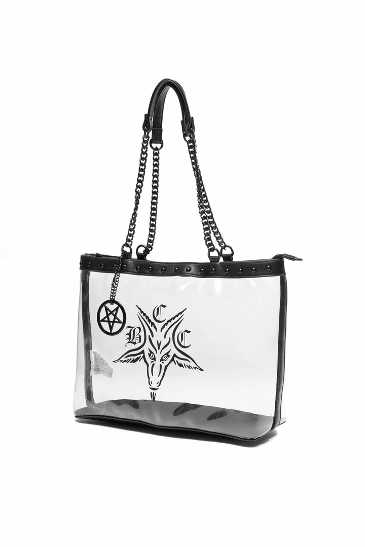 Premium heavy PVC clear material large tote bag. Matte black hardware with detachable pentagram key chain. This makes for a great beach bag or for venues requiring clear bag policy.