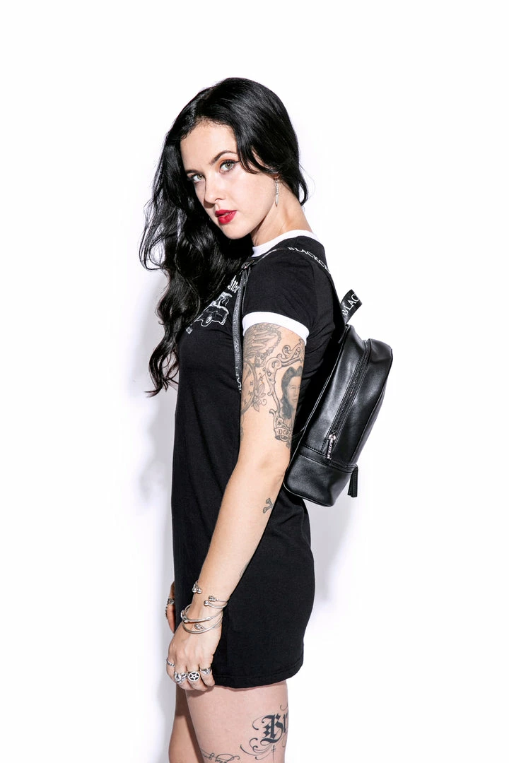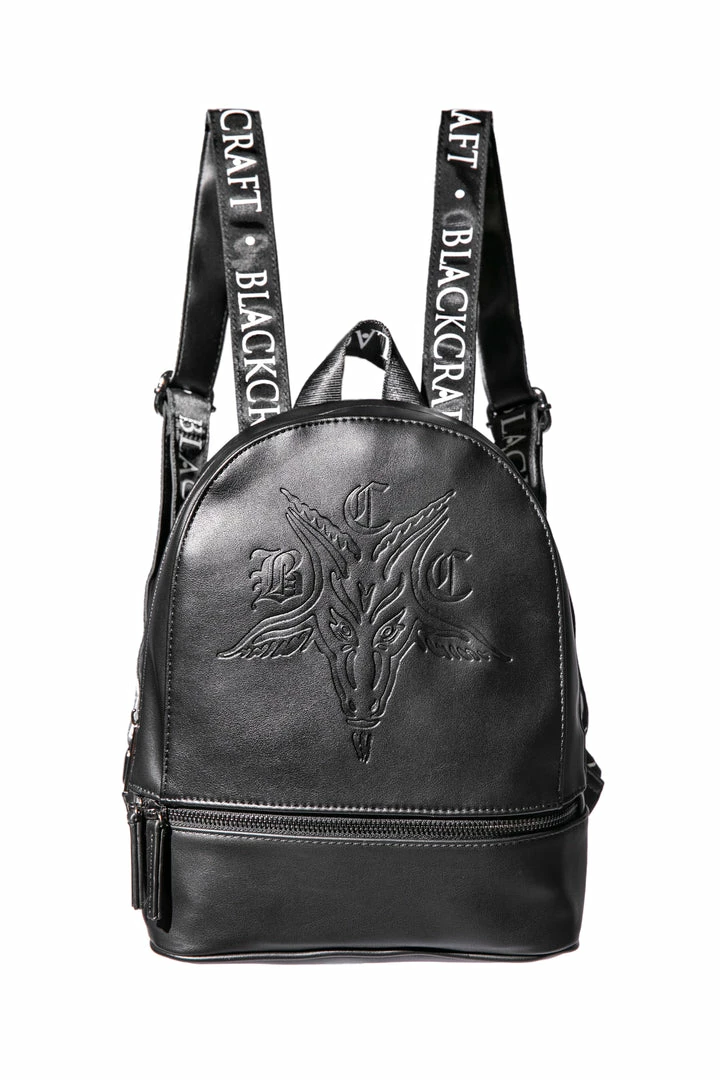Faux leather medium sized backpack. Embossed BCC Goat logo on front. Adjustable Blackcraft logo webbing straps with gunmetal finish Blackcraft zippers. Interior features 1 zip pocket, 1 slit pocket and custom interior lining.