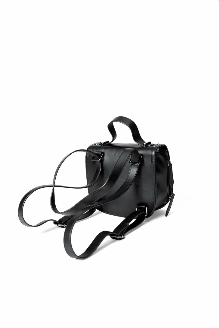 Interchangeable mini backpack to crossbody with BCC Goat embossed and gunmetal hardware on the front. Flap button closure and zipper details.