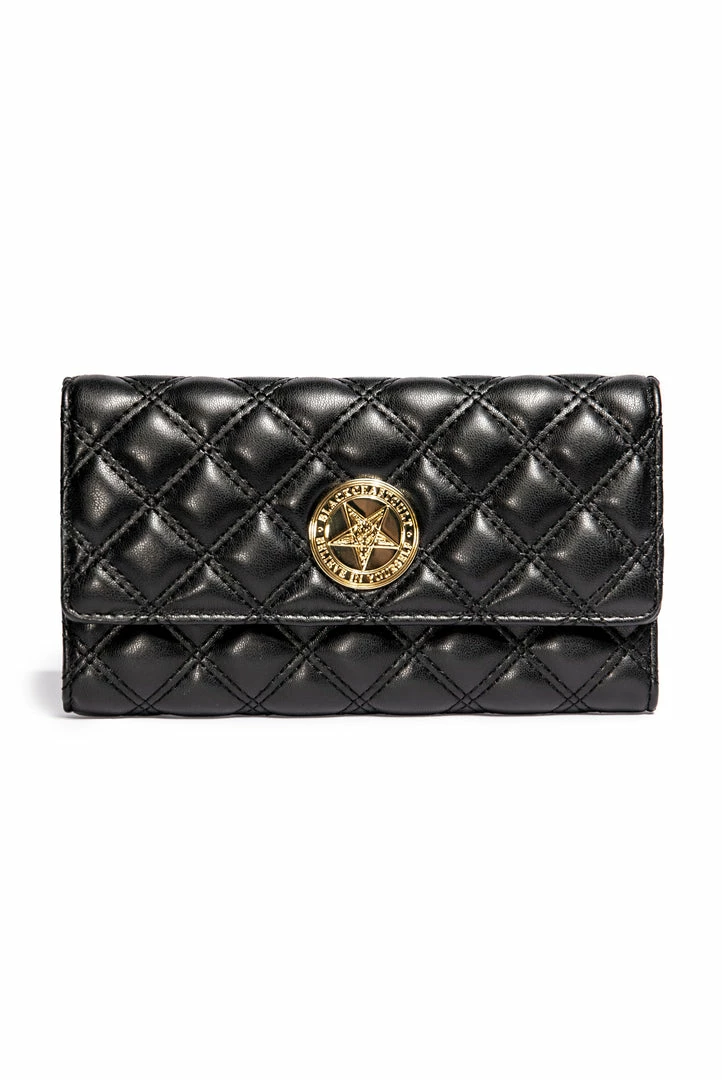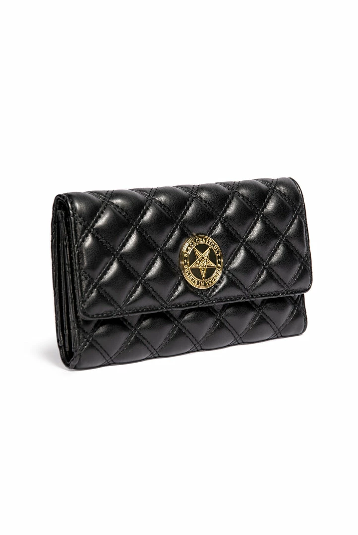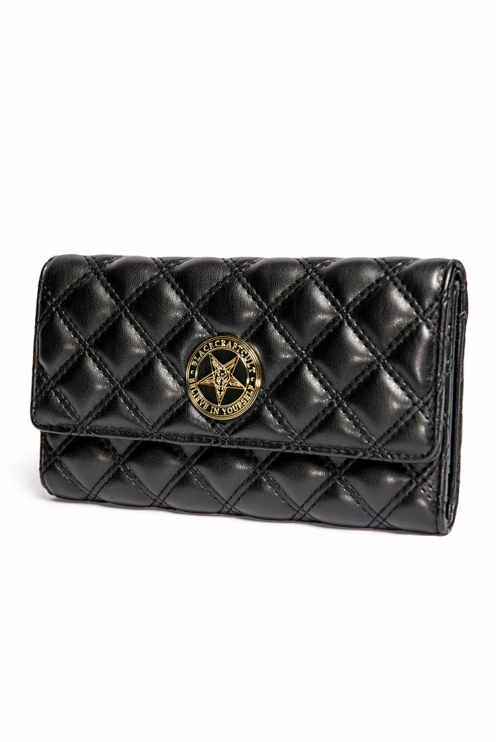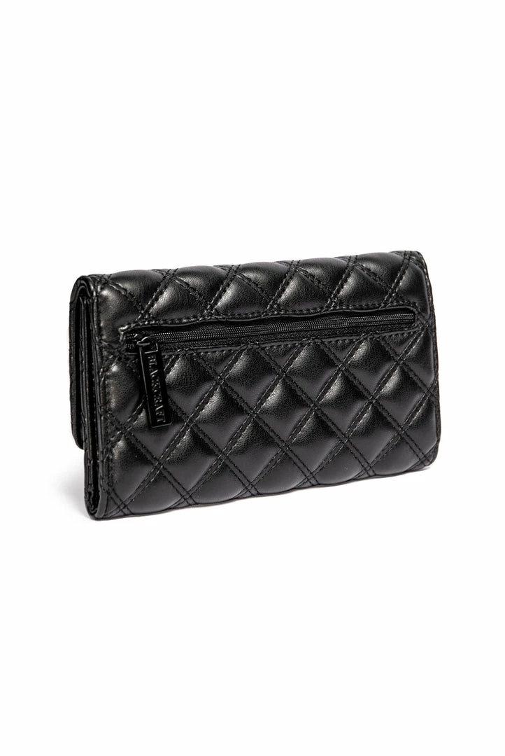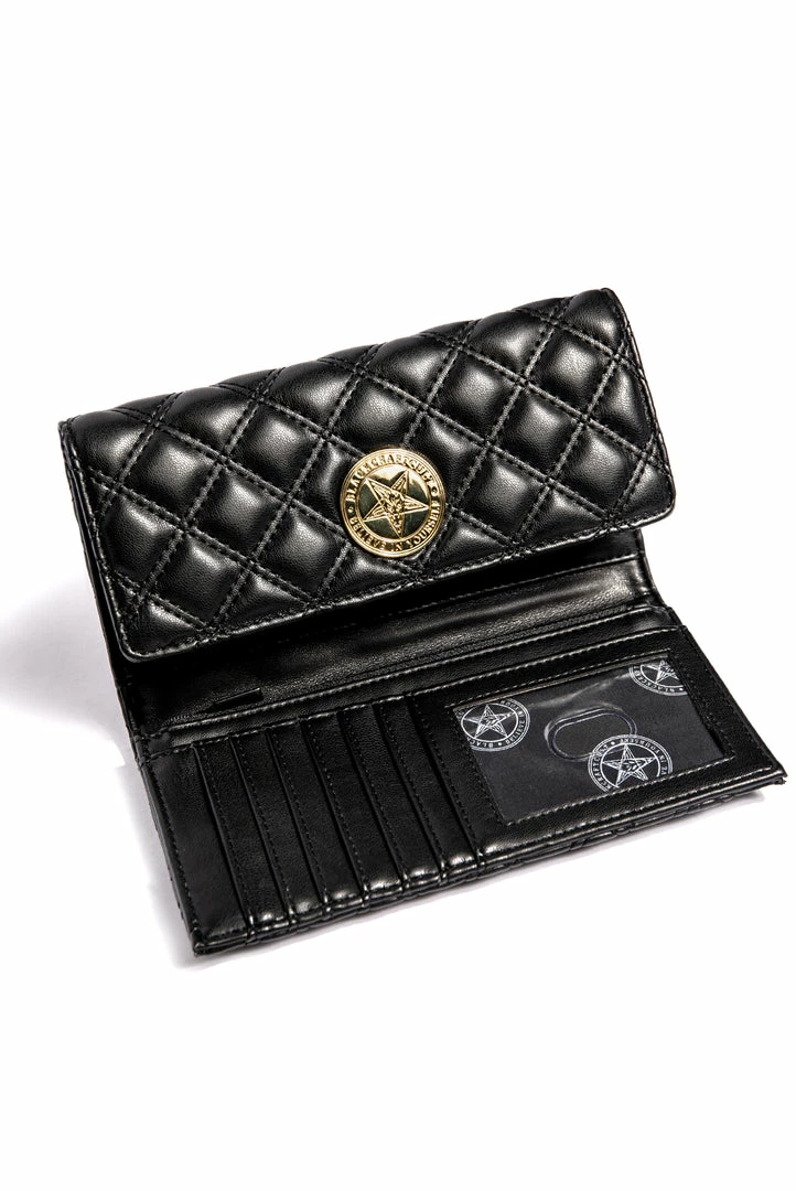 Faux leather slim clutch wallet features quilted design with gold hardware. Includes 15 credit card slots, interior pockets,聽zip pockets.