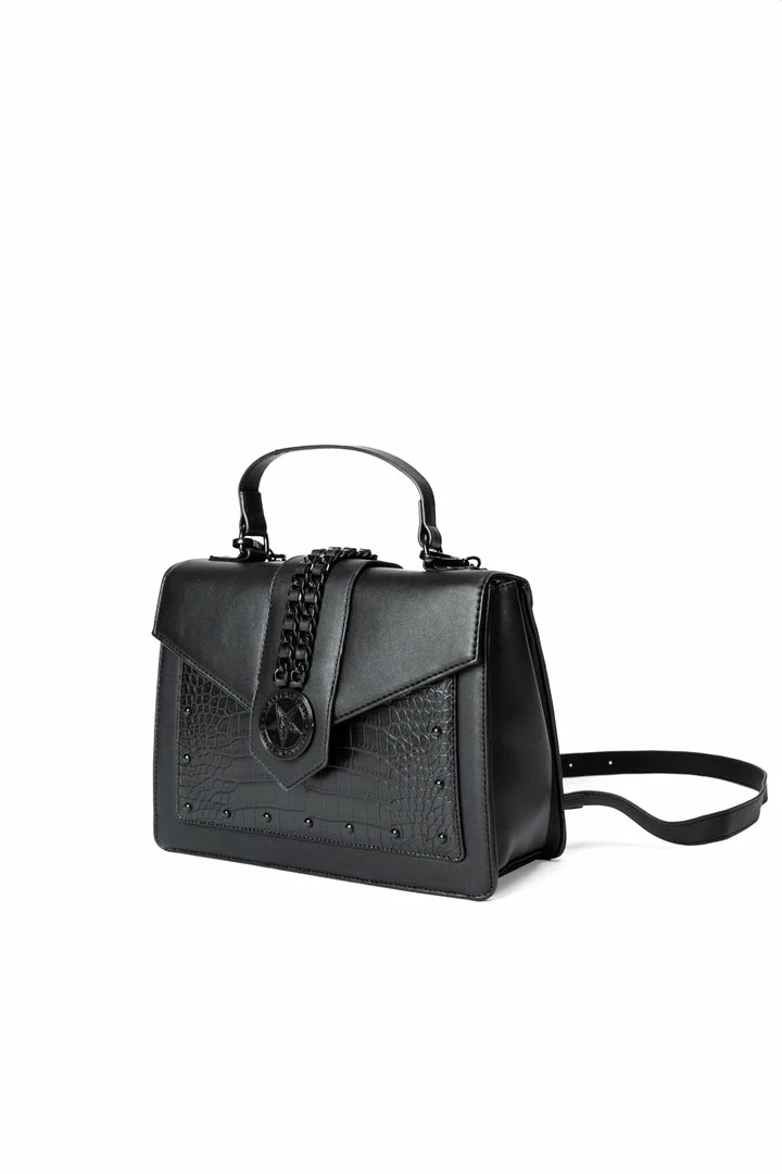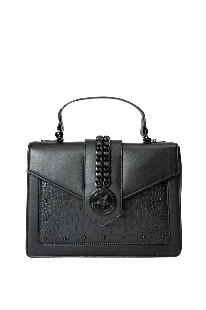 Faux leather square top handle with adjustable and removable crossbody strap. Flap magnetic button closure with matte black Believe in Yourself hardware and chain detailing.