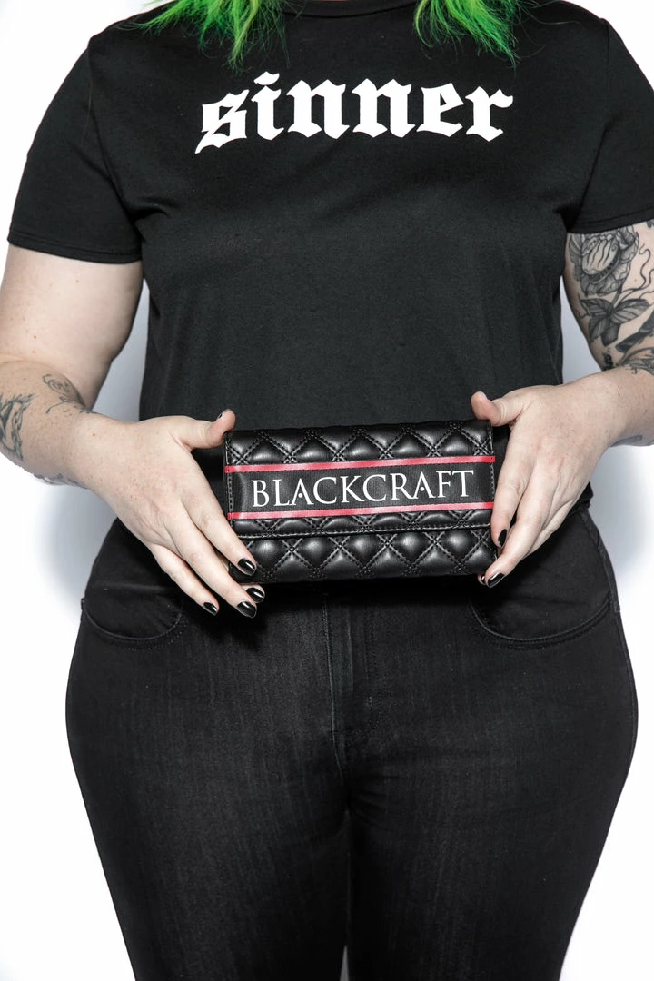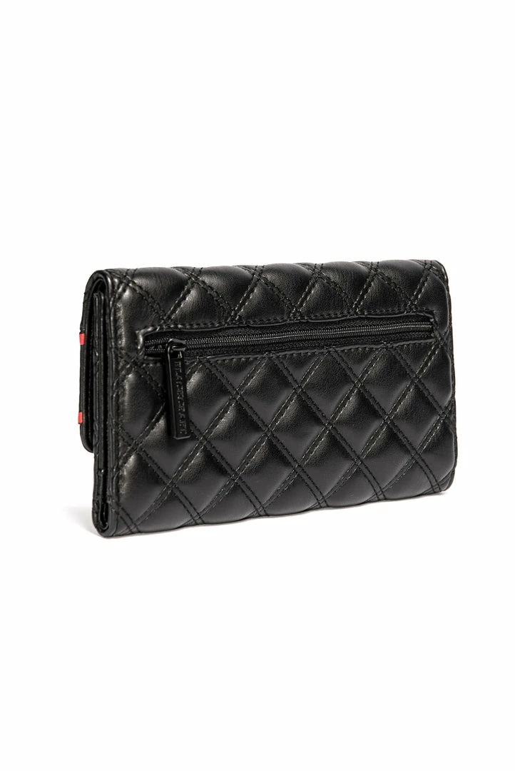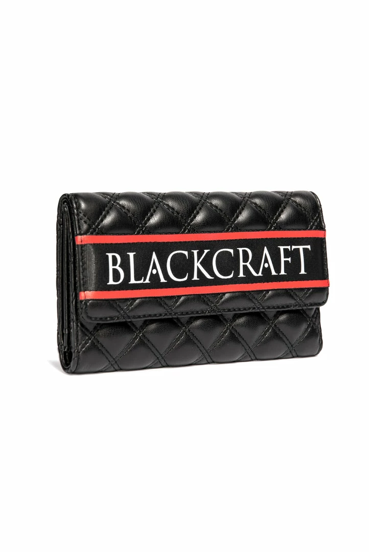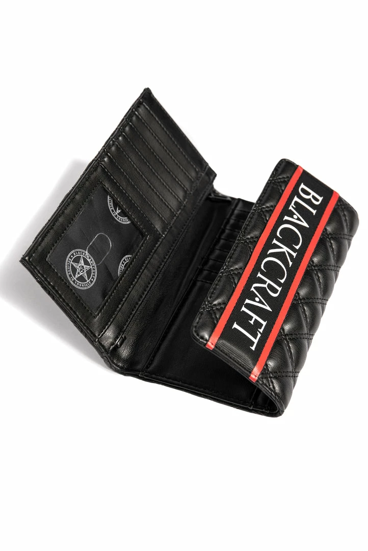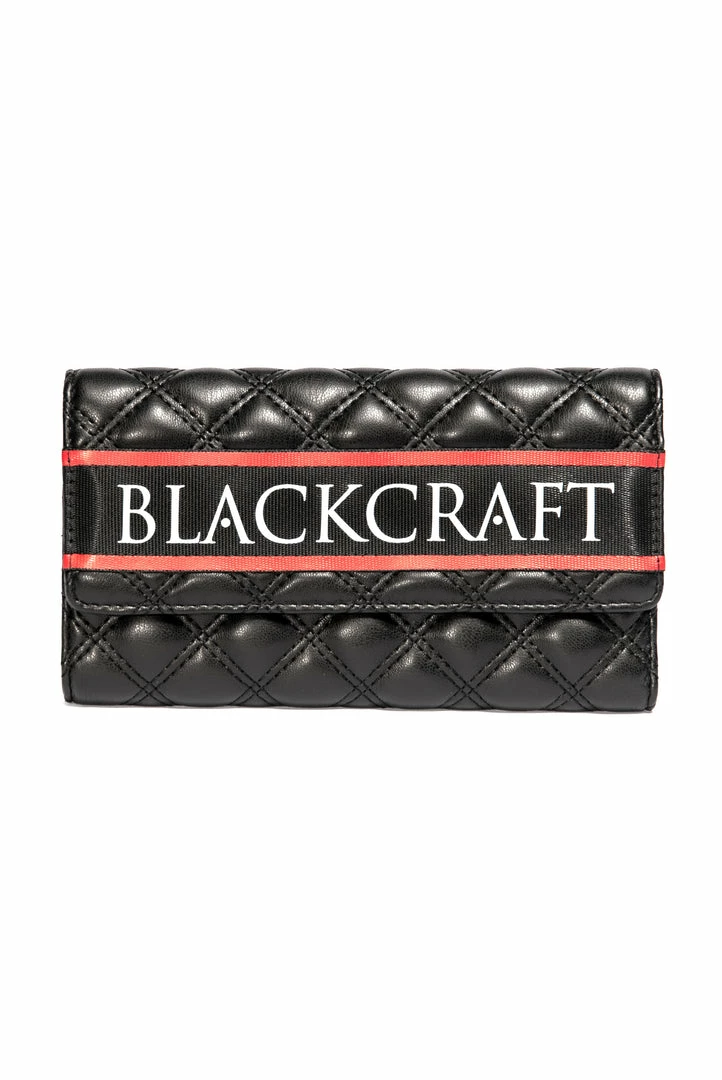 Faux leather slim clutch wallet features quilted design with Blackcraft nylon logo tape. Includes 15 credit card slots, interior pockets, zip pockets.