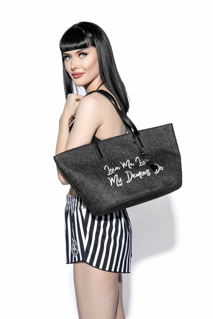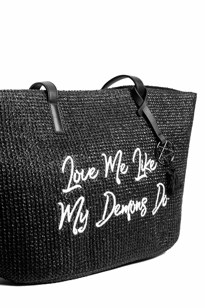 Straw Tote with embroidered “Love Me Like My Demons Do” detail. Features an inside pocket.