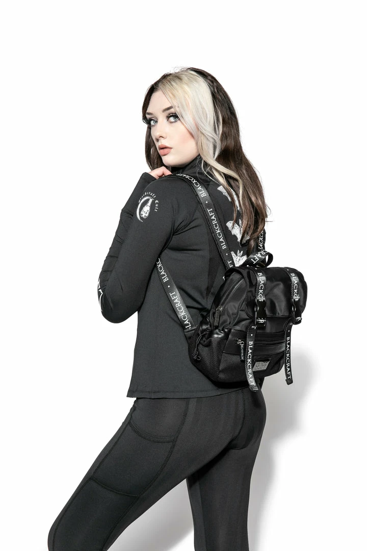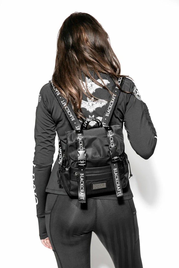 Mini mesh utility backpack with logo strap details and adjustable logo straps. Features elastic cord side closure and Blackcraft gunmetal logo plaque.
