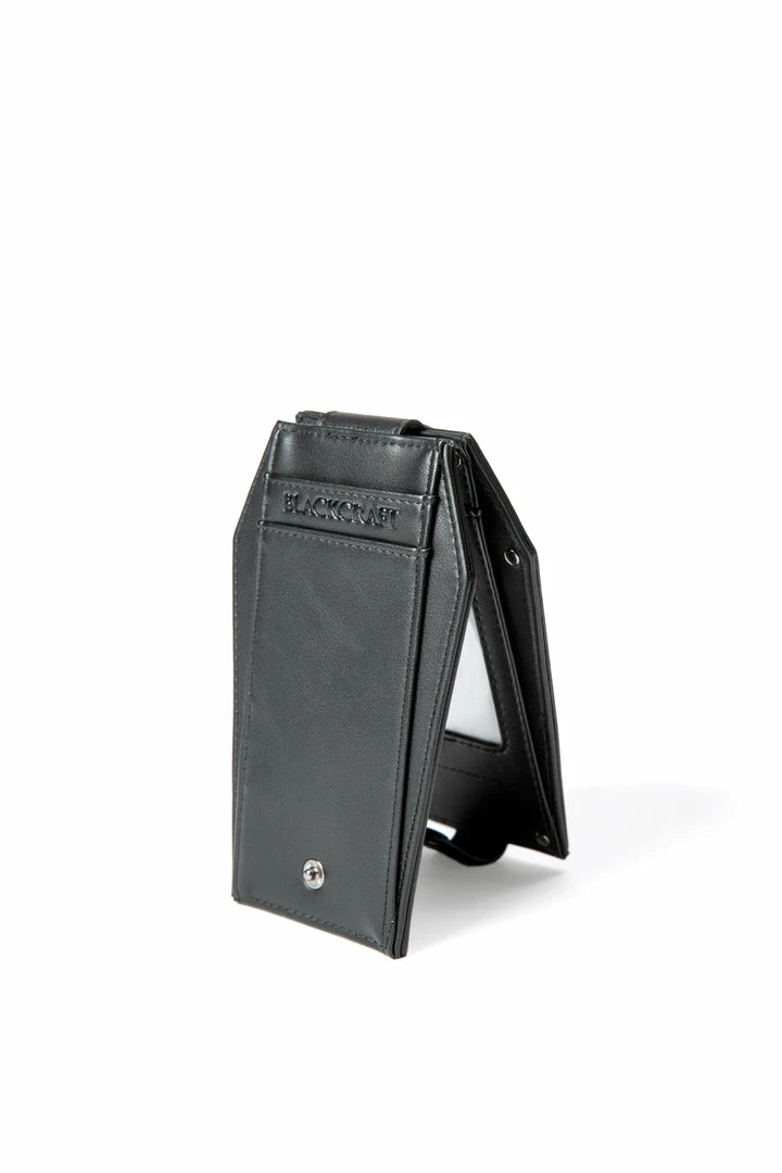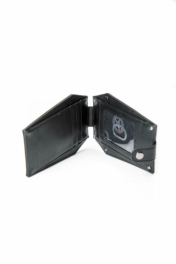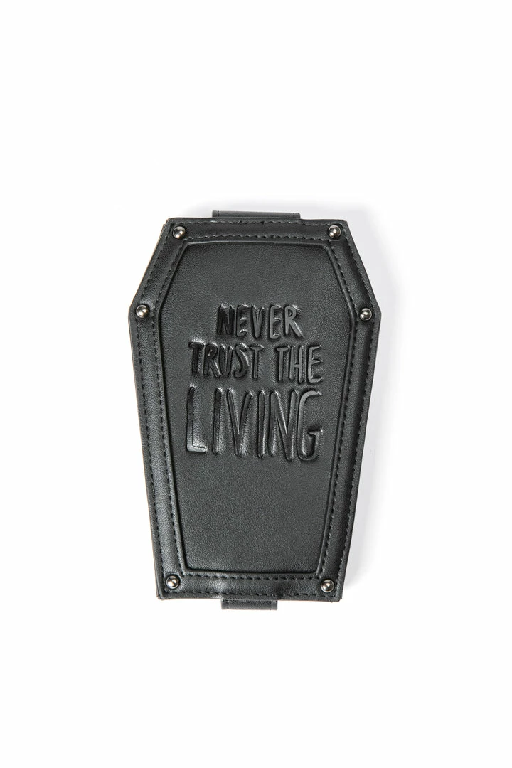Faux leather cardholder in coffin shape with Never Trust the Living embossed on the front. Inside features ID and card slots with button closure and extra card slots on the back.