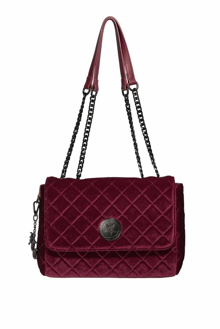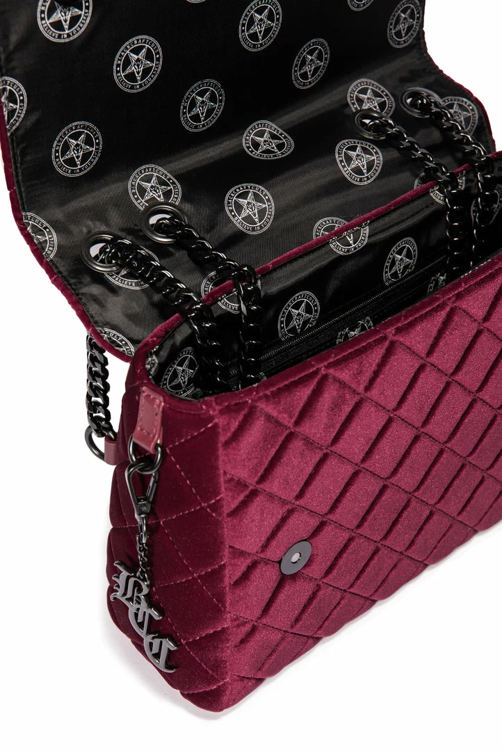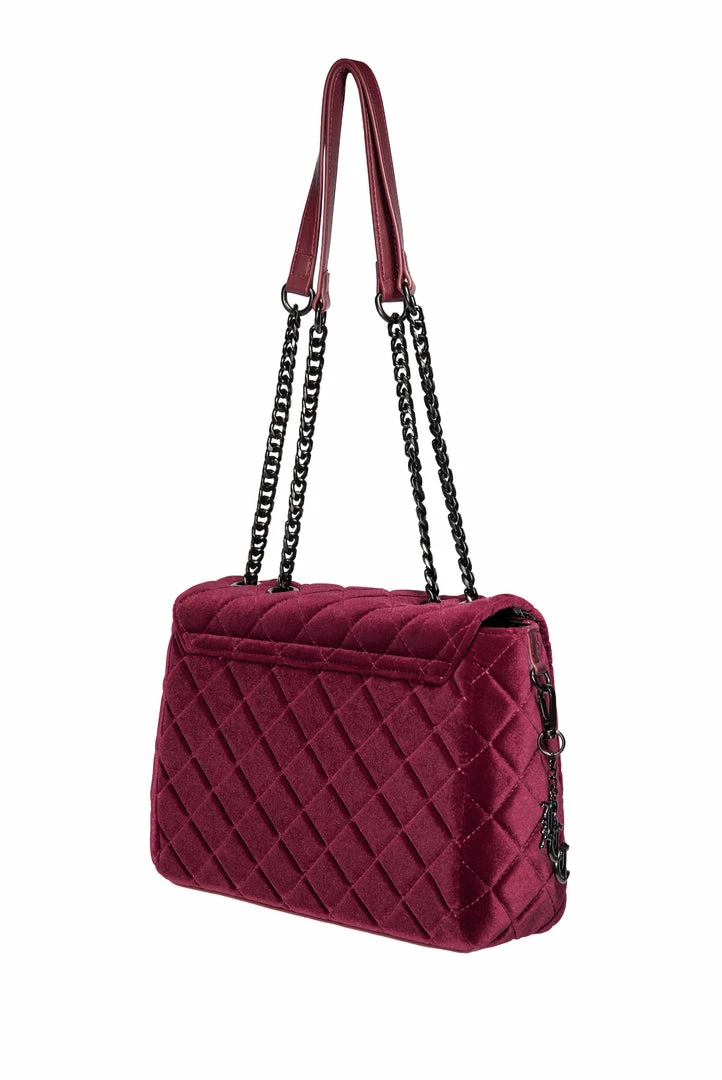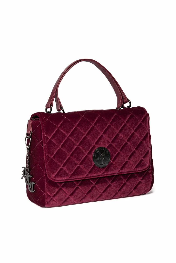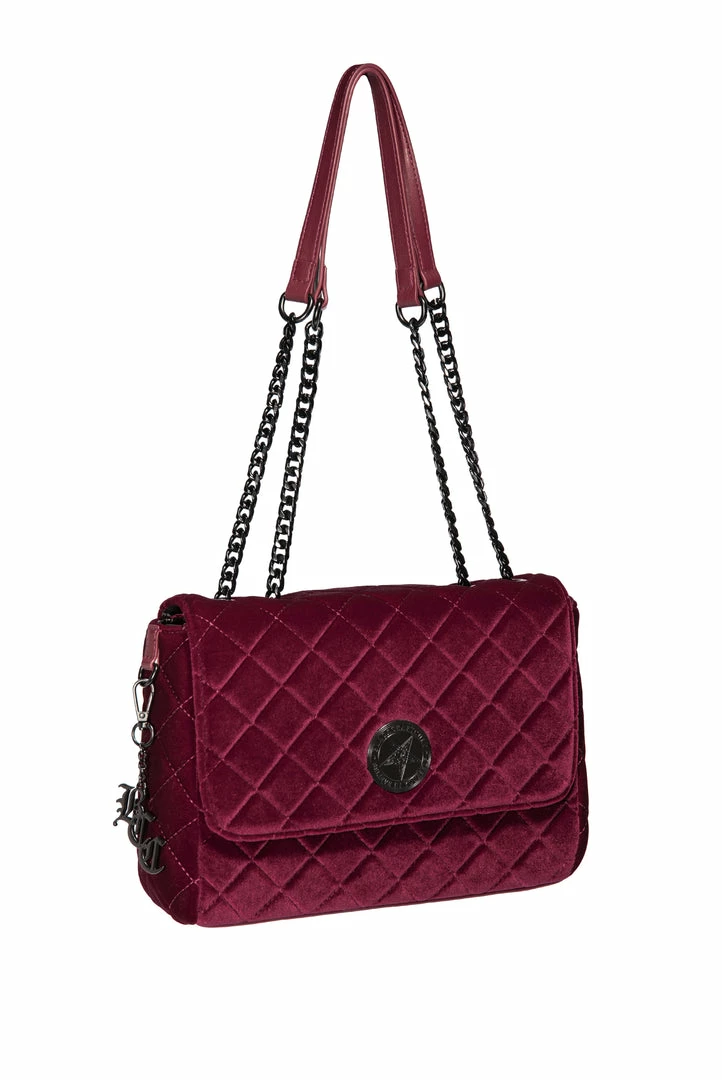 Lux oxblood velvet satchel with flap closure. Quilted design with matte black hardware, chain and leather straps, and BCC keychain. Straps can be used as a shoulder bag or crossbody bag.