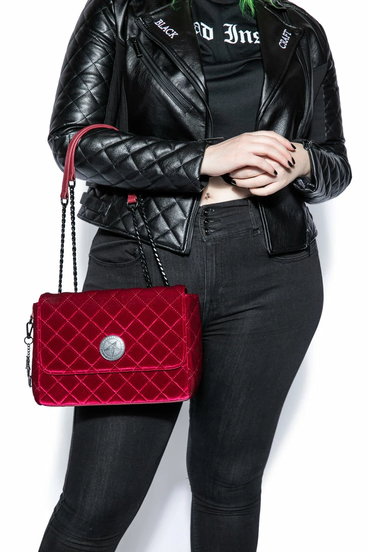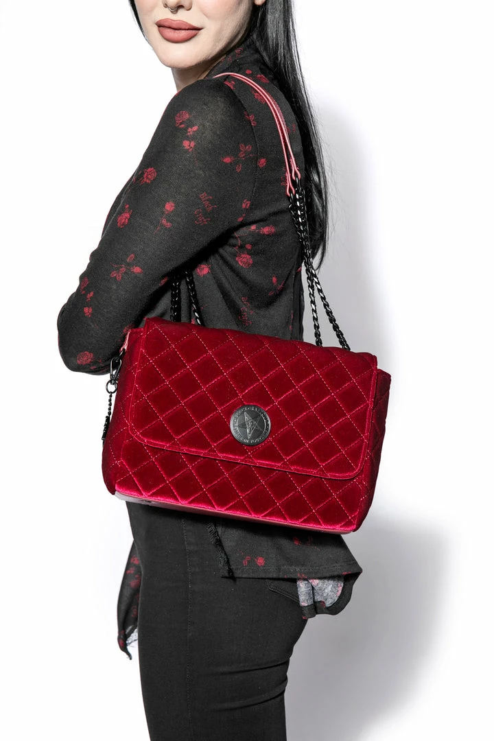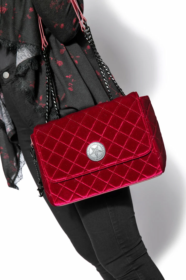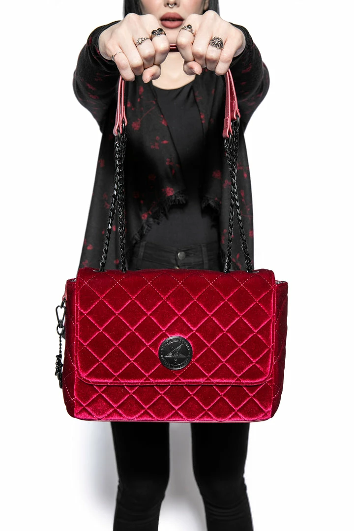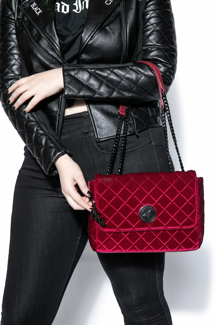 Lux oxblood velvet satchel with flap closure. Quilted design with matte black hardware, chain and leather straps, and BCC keychain. Straps can be used as a shoulder bag or crossbody bag.