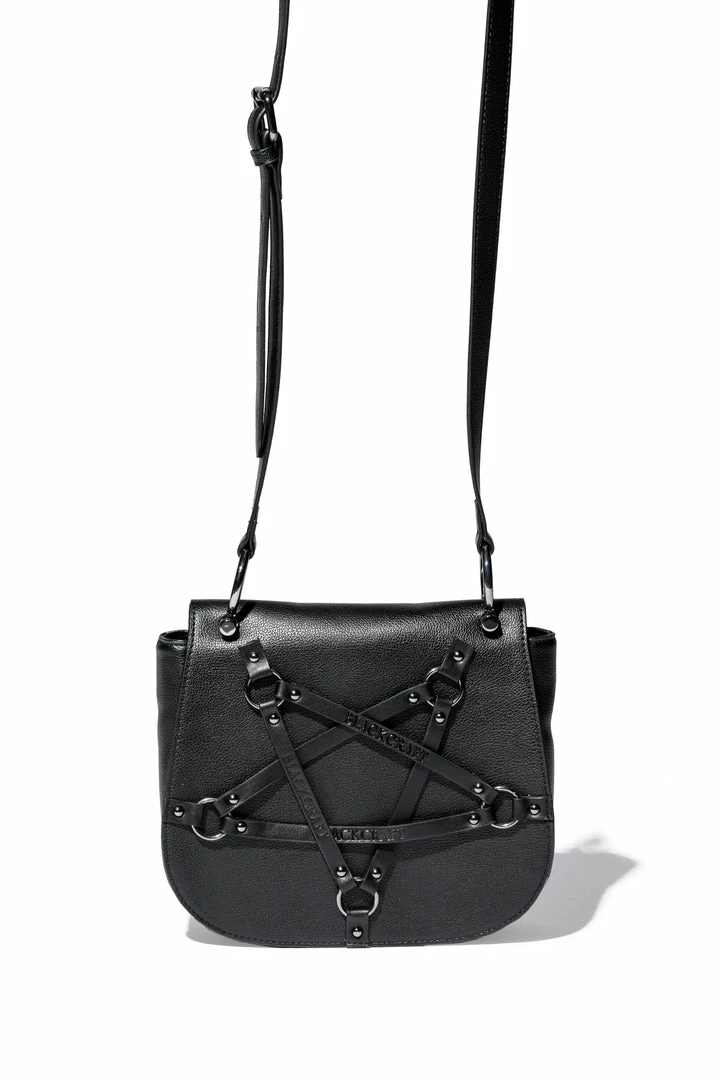 Faux leather crossbody with Blackcraft logo embossed pentagram harness on front flap. Features gunmetal hardware as well as custom interior lining.