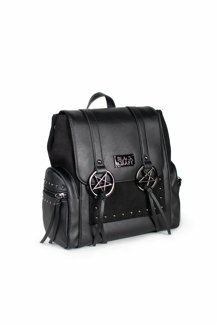 Based upon the design of our best selling Pentagram Messanger Bag, this backpack features adjustable straps, faux suede detail on front slit pocket and gunmetal finish hardware.