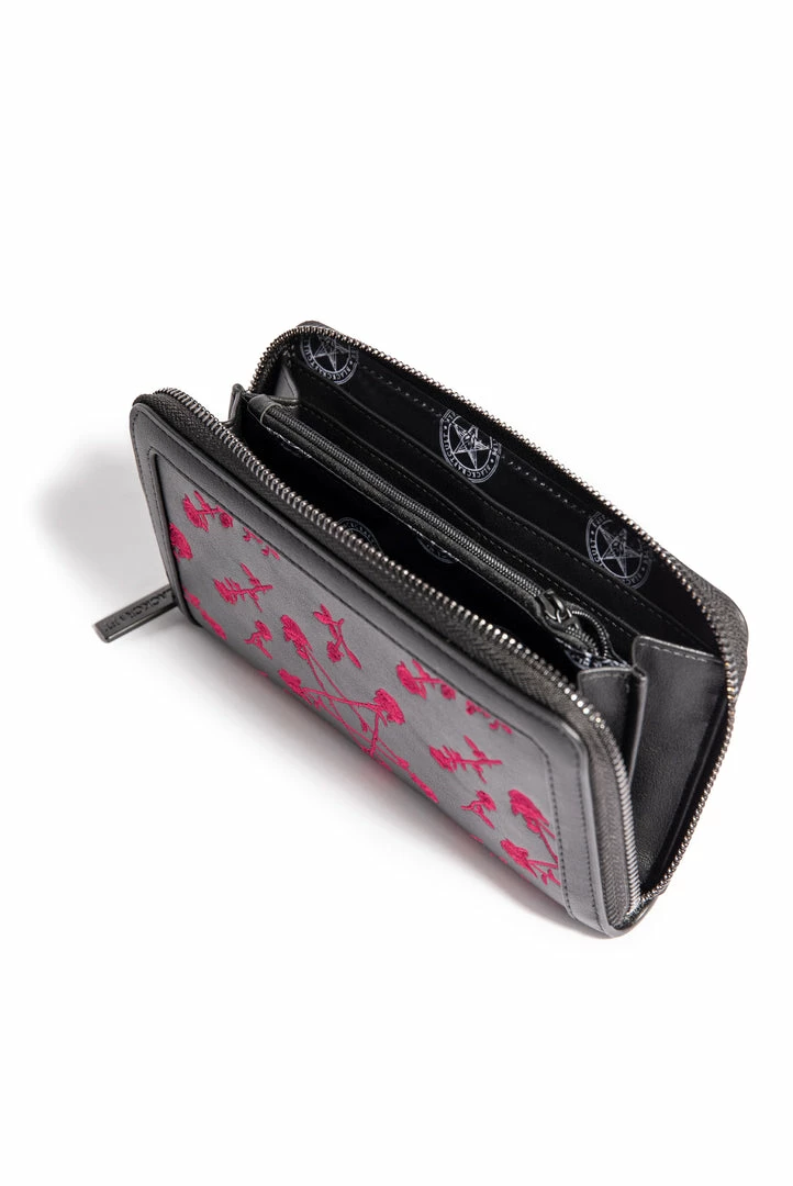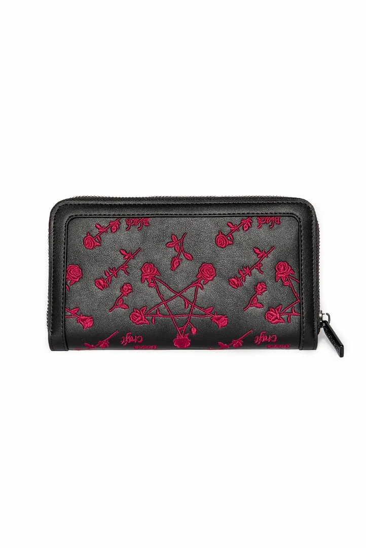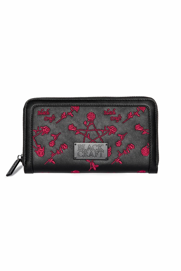 PU zip around wallet with embroidered Pentagram Rose design. Matte black finish Blackcraft logo zipper and logo hardware plaque. Features interior zip pocket as well as 12 credit card slots and custom interior lining.