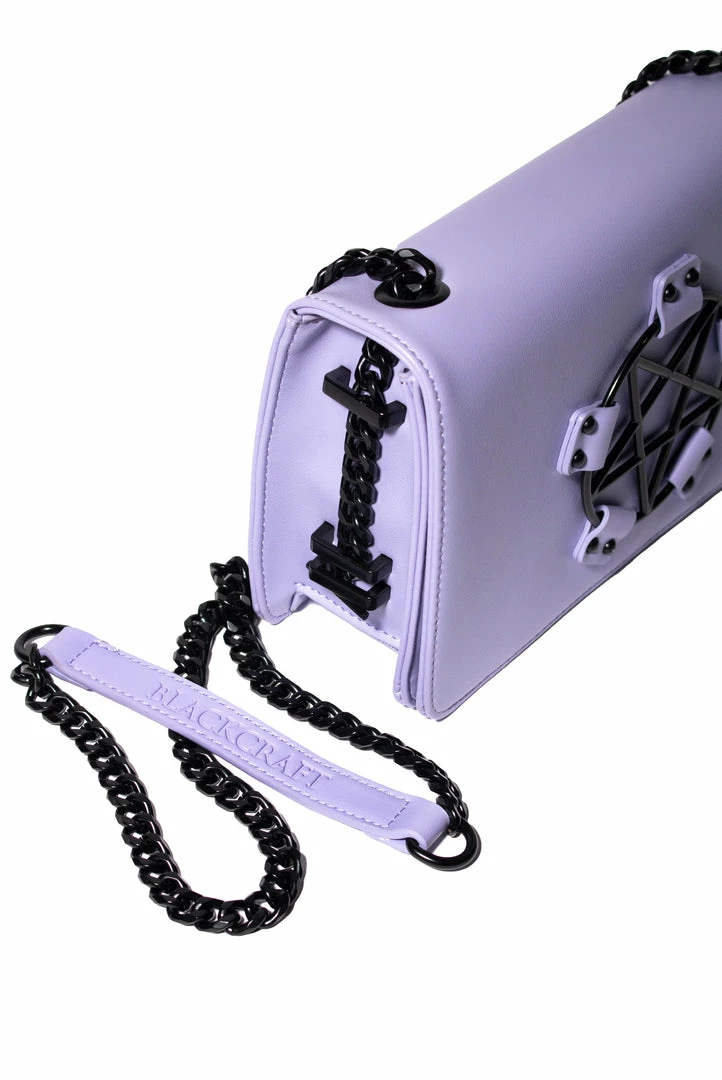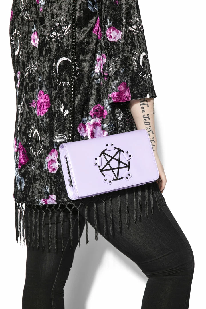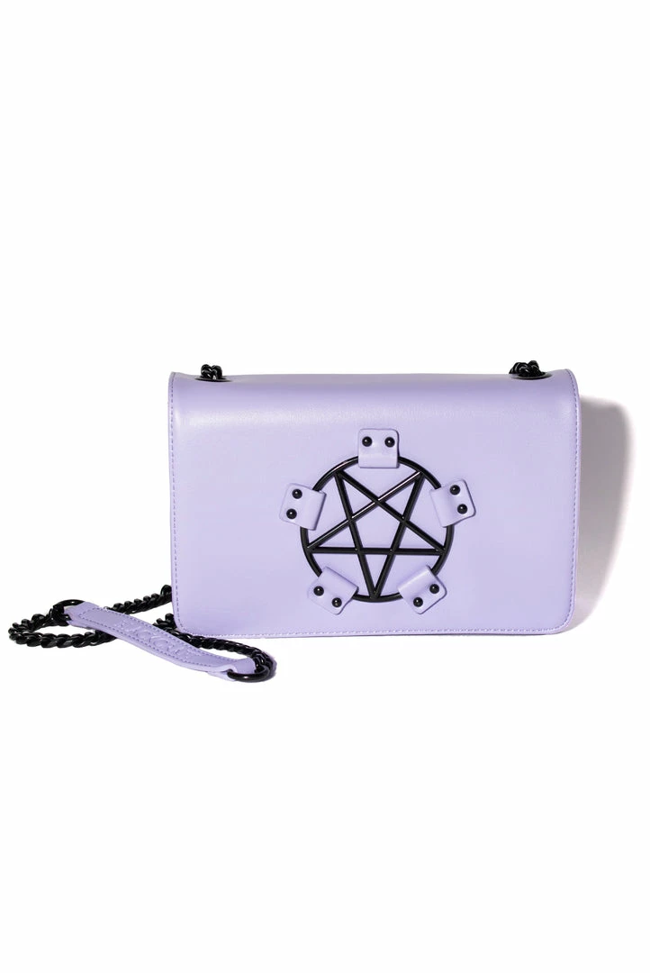 Faux leather crossbody with gunmetal finish pentagram hardware detail.
